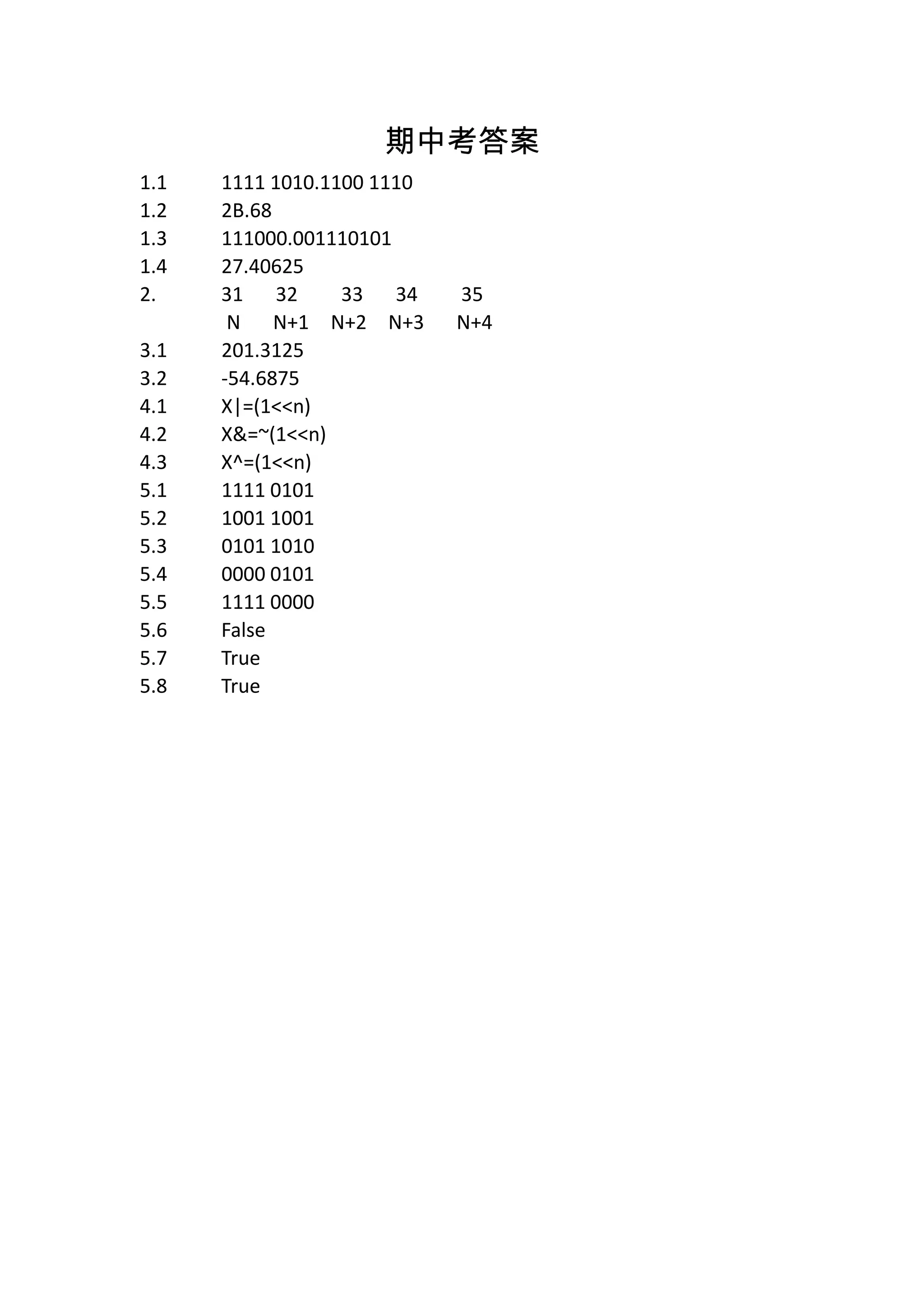 1110 1.2 2B.68 1.3 111000.001110101 1.4 27.40625 2. 31 32 33 34 35 N N+1 N+2 N+3 N+4 3.1 201.3125 3.2 -54.6875 4.1 X|=(1<<n) 4.2 X&=~(1<<n) 4.3 X^=(1<<n) 5.1 1111 0101 5.2 1001 1001 5.3 0101 1010 5.4 0000 0101 5.5 1111 0000 5.6 False 5.7 True 5.8 True