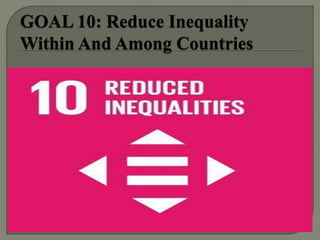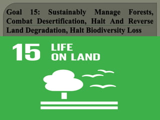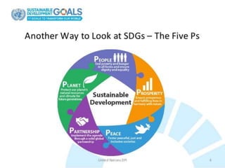 The document summarizes the Millennium Development Goals (MDGs) established by the United Nations in 2000 and provides an update on progress towards achieving the goals by 2015. It discusses the eight MDGs, which included targets related to poverty reduction, education, gender equality, child and maternal health, HIV/AIDS, and environmental sustainability. While significant progress was made in areas like reducing poverty and improving access to water, not all targets were fully met by the 2015 deadline. In 2015, the UN then adopted 17 new Sustainable Development Goals to build on the momentum and lessons of the MDGs to tackle economic, social and environmental challenges through 2030.