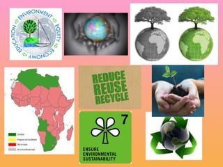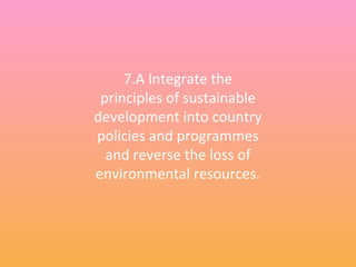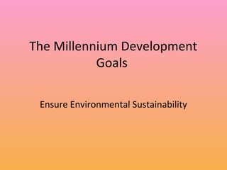 The document discusses progress on Millennium Development Goal 7 of ensuring environmental sustainability. It outlines targets to integrate sustainable development principles, reduce biodiversity loss and the proportion of people without access to safe drinking water and basic sanitation, and improve the lives of 100 million slum dwellers. While some regions and habitats still face challenges, overall the world has met or is making progress on these targets, with over 2 billion gaining access to clean water and the urban slum population declining since 2000.