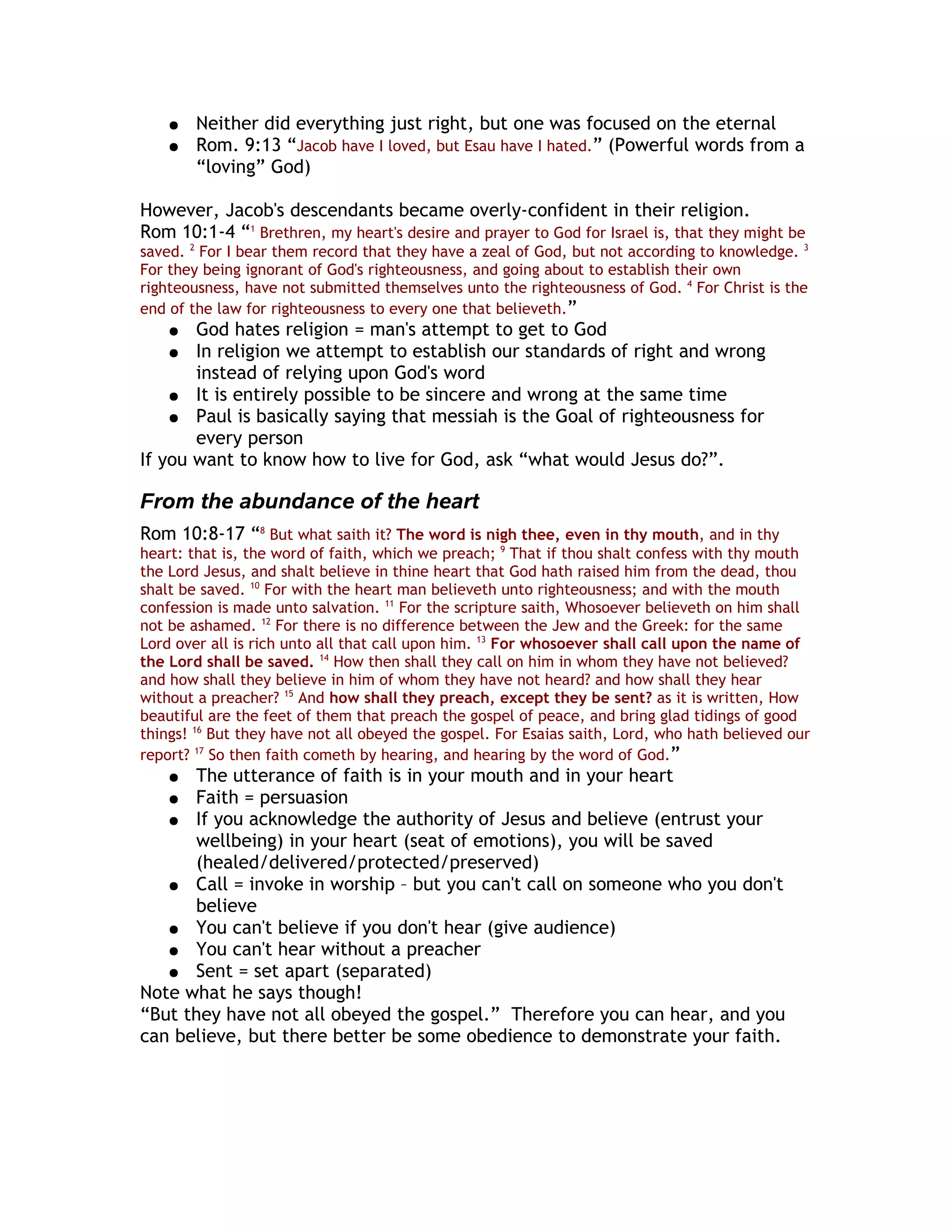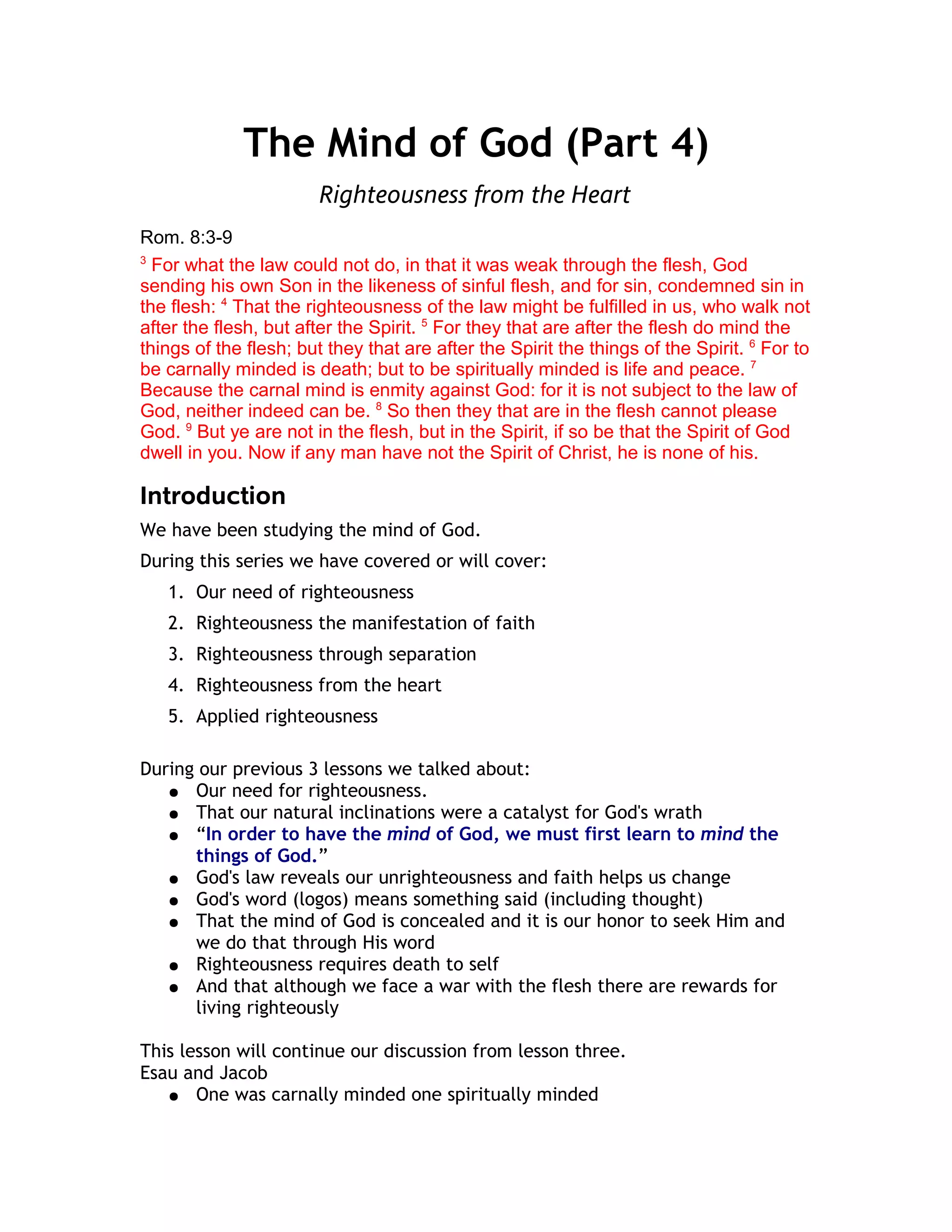 This document discusses the concept of righteousness from a biblical perspective, emphasizing that true righteousness comes from the heart and is manifested through faith and obedience to God's word. It highlights the contrast between being carnally minded and spiritually minded, using the examples of Jacob and Esau to illustrate the importance of pursuing God's righteousness over establishing one's own standards. The text calls for a transformation of the mind and emphasizes the necessity of studying scripture to align oneself with the mind of God.