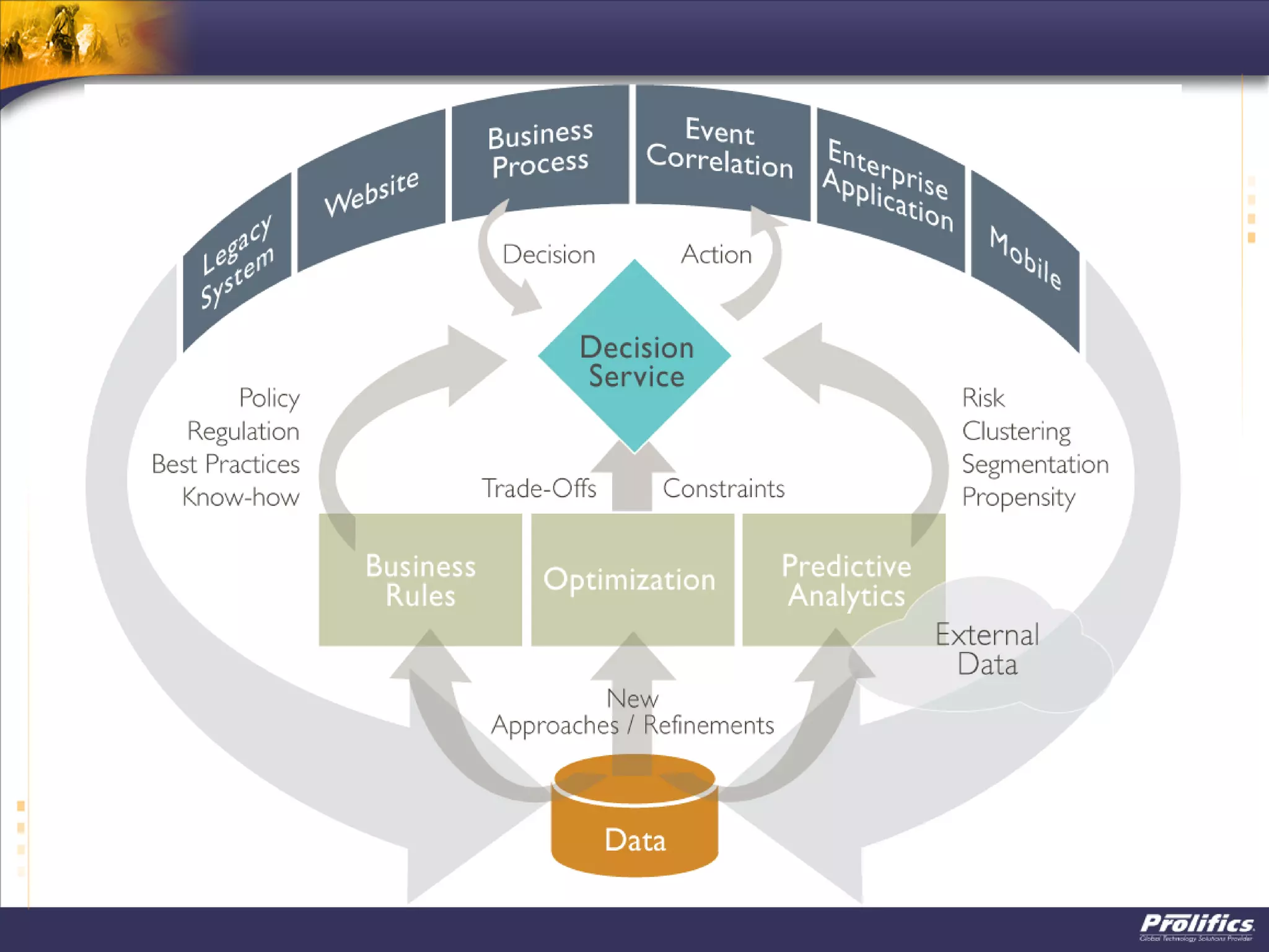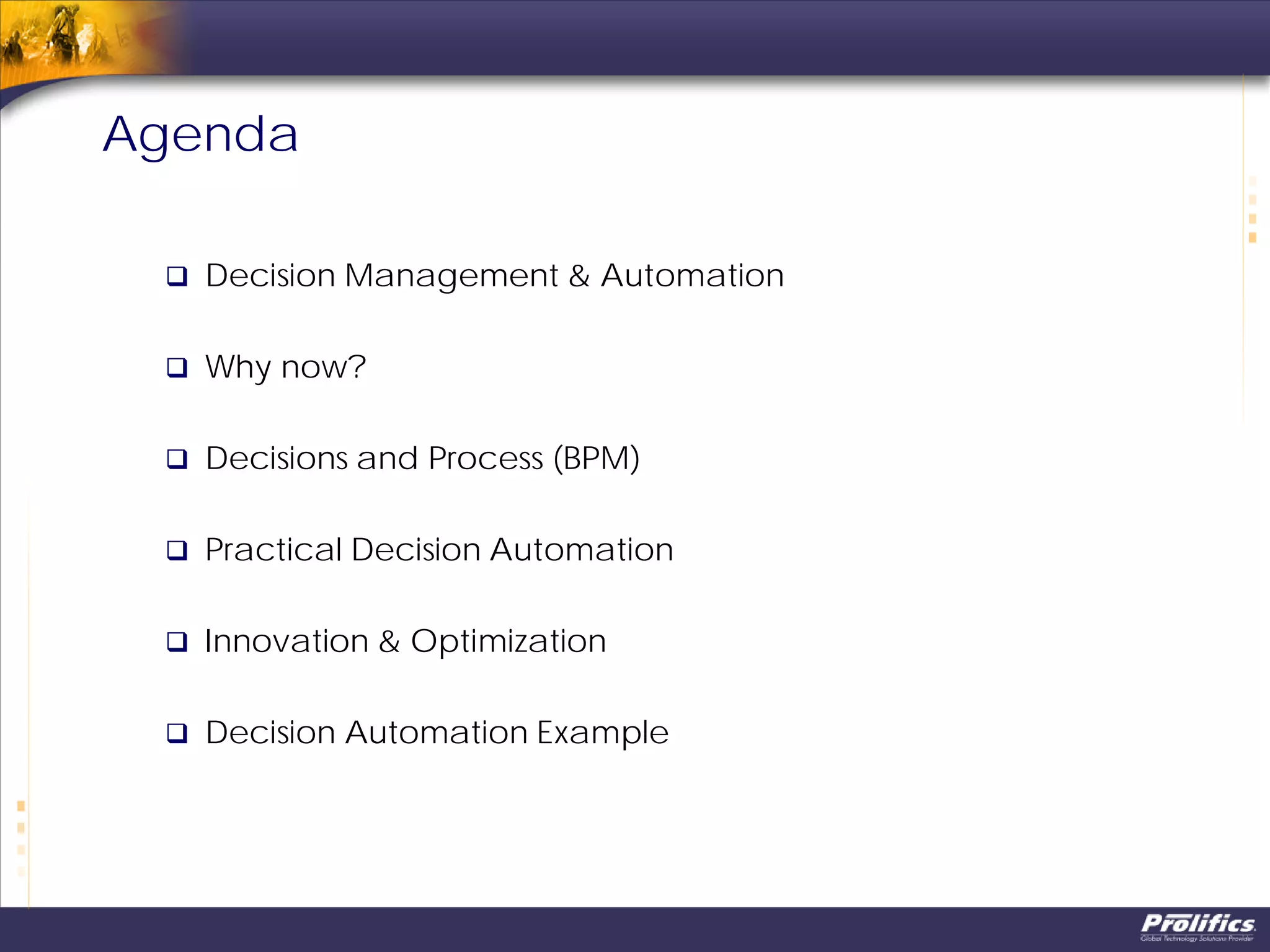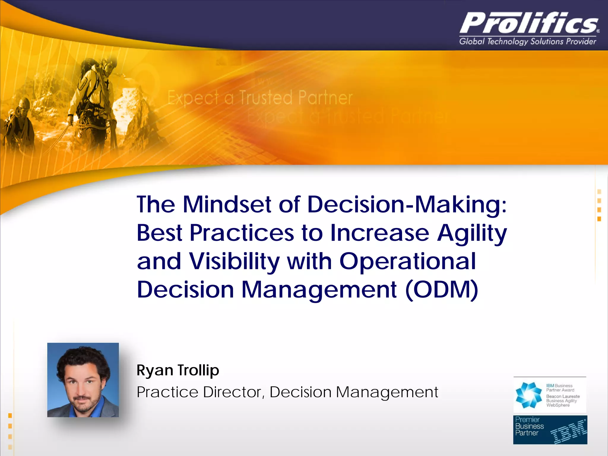 The document discusses operational decision management (ODM) and best practices for increasing agility and visibility with decision automation. It describes how decisions are found throughout business processes in areas like insurance, banking, healthcare, and more. Automating decisions can simplify processes by extracting business rules and encapsulating them in decision models. This allows for centralized management of decisions independent of processes. The document advocates using analytics to continuously improve decisions and processes over time through predictive analysis and optimization. It provides an example reference architecture and use cases for automating customer-related decisions to improve cross-selling based on behaviors and external events.