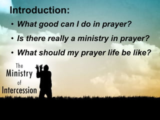 Prayer is an important ministry that benefits both God and others. It allows us to praise and serve God as our High Priest. Prayer is also how we ask God for help in times of need and bring our requests to Him with thanksgiving. Additionally, prayer is a ministry for others as we can pray on their behalf and access God's power through prayer to do good for others. The document provides guidelines for an effective prayer life, suggesting that prayer should be purposeful, reaching out to God, abiding with God continually, and yielding ourselves to God's will.