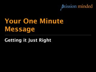 The document outlines how to craft a concise and inspiring one-minute message to effectively communicate an organization's mission and vision. It emphasizes the importance of clarity, audience engagement, and understanding the impact of an organization's work, using examples from various education-focused organizations. The document also highlights the need to address societal issues concerning children's well-being and the value of community-focused initiatives.