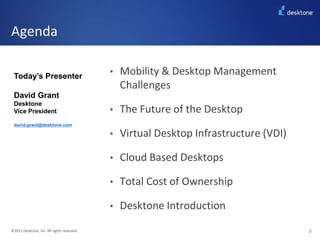 The document discusses cloud-hosted virtual desktops as an alternative to traditional desktop management. It outlines the challenges with traditional desktops and introduces virtual desktop infrastructure (VDI) and cloud-based desktops as more cost-effective solutions. Desktone is presented as a provider of cloud-hosted virtual desktops that offers savings over on-premises VDI through lower upfront costs, simplified management, and pay-as-you-go pricing. Total cost of ownership analyses show Desktone can reduce costs by 20% compared to on-premises VDI and 36% compared to physical desktop PCs.