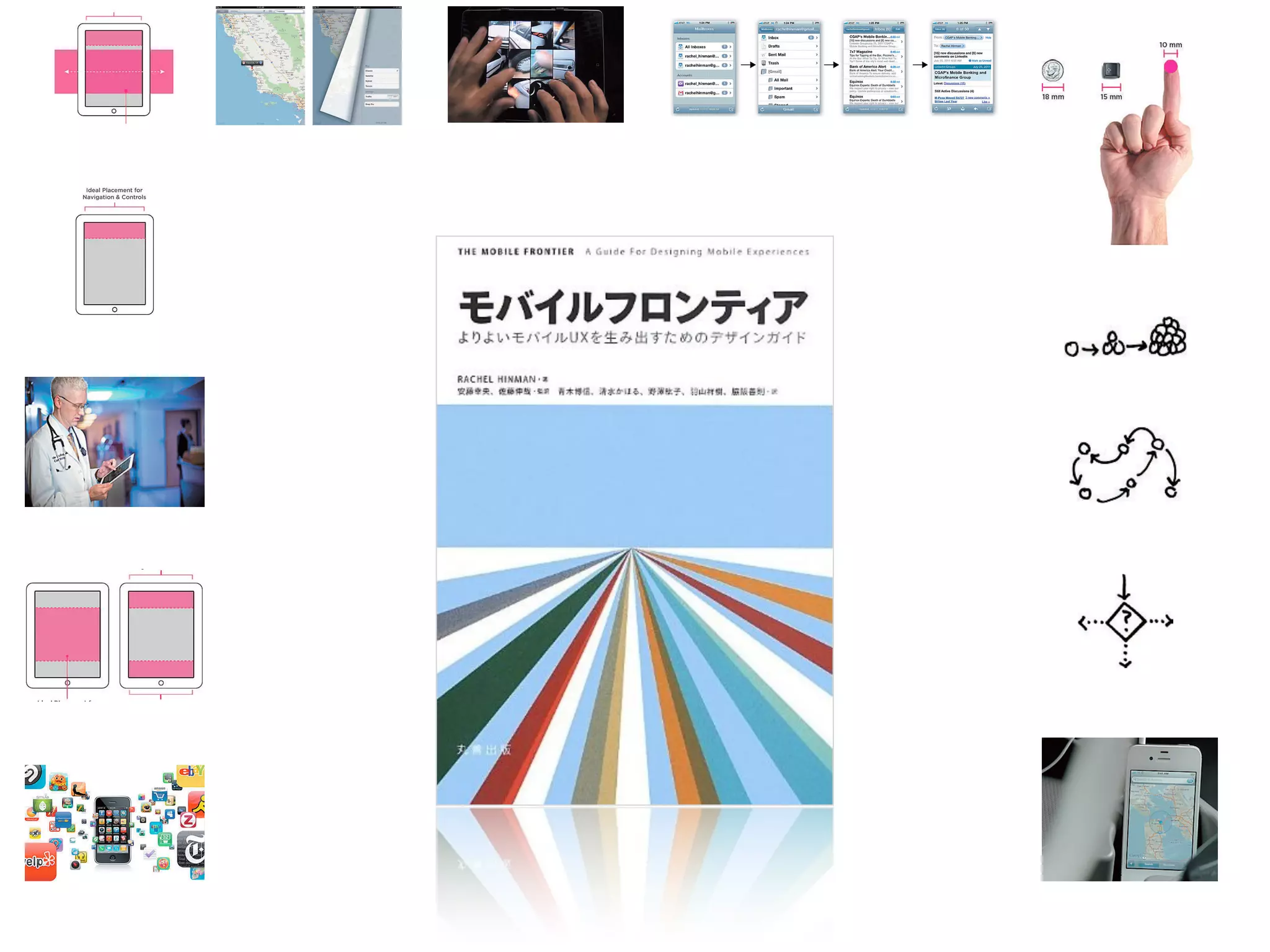 P.231 より 「人間は実際に見なくても、どこで何が起こっているかをとても 正しく把握することができます。消防車の音、ゴミの臭い、地震の 揺れ。私たちは感覚を使って本能的に身のまわりの状況を把握して います」 P.232より 「モバイルUXをデザインする際に考慮すべき、十分に活用されて いない3つの感覚をとりあげます。それは、タッチ、ジェス チャー、音声とサウンドです」