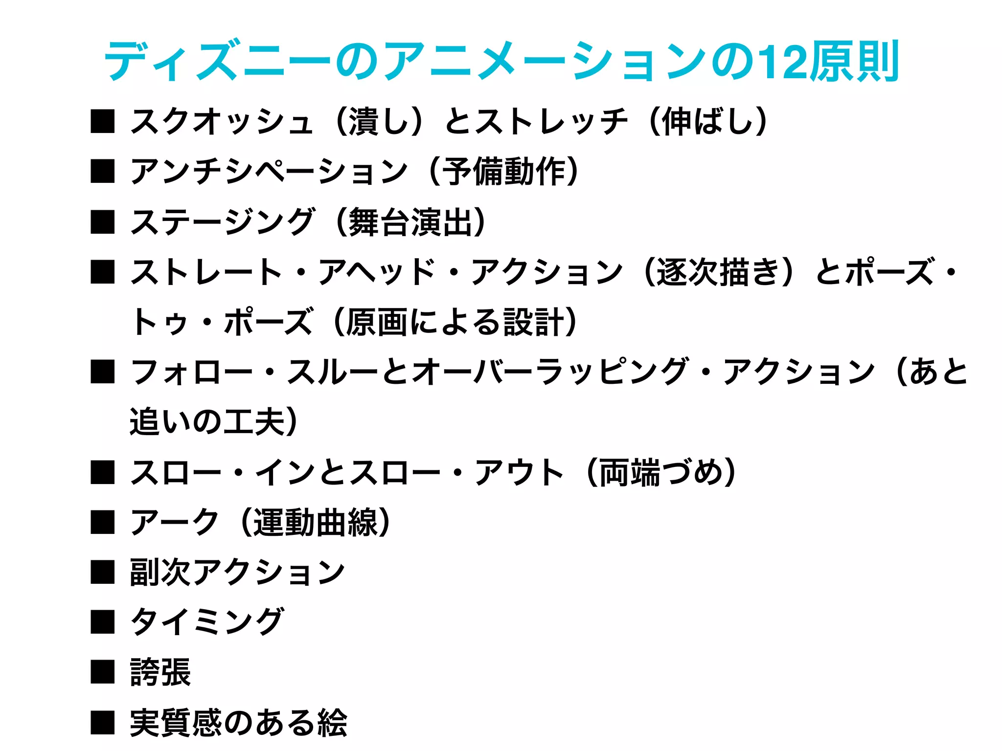 ステージング(舞台演出) ■ ストレート・アヘッド・アクション(逐次描き)とポーズ・ トゥ・ポーズ(原画による設計) ■ フォロー・スルーとオーバーラッピング・アクション(あと 追いの工夫) ■ スロー・インとスロー・アウト(両端づめ) ■ アーク(運動曲線) ■ 副次アクション ■ タイミング ■ 誇張 ■ 実質感のある絵