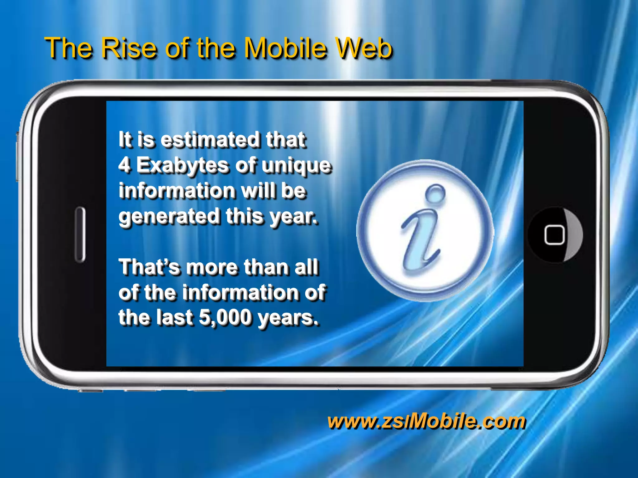 The document discusses the exponential growth of information and technology, highlighting how rapidly evolving job markets and educational content are influenced by emerging technologies. It notes significant trends in mobile usage, including a rise in mobile internet users, mobile shopping, and app downloads, forecasting continued growth in mobile advertising and commerce. Additionally, it emphasizes the importance of speed and user experience in mobile applications and services.