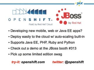 This document summarizes a presentation about developing for the mobile web using Java technologies. It discusses native mobile apps, mobile web apps, and hybrid apps. It recommends using a framework like JSF 2 and RichFaces which provides standard-based mobile support today and advanced features in development, allowing the use of as much or as little of the Java EE stack as needed. It also discusses HTML5, CSS3, device detection, and orientation support to optimize mobile web experiences.