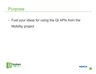 The document outlines the Qt Mobility Project focused on developing APIs to facilitate mobile application creation across platforms. It covers critical features such as bearer management for connections, contact management, messaging functionalities, location services, and a publish and subscribe service framework. The project aims to empower developers with tools for building rich, cross-platform applications while soliciting feedback on API utilization.