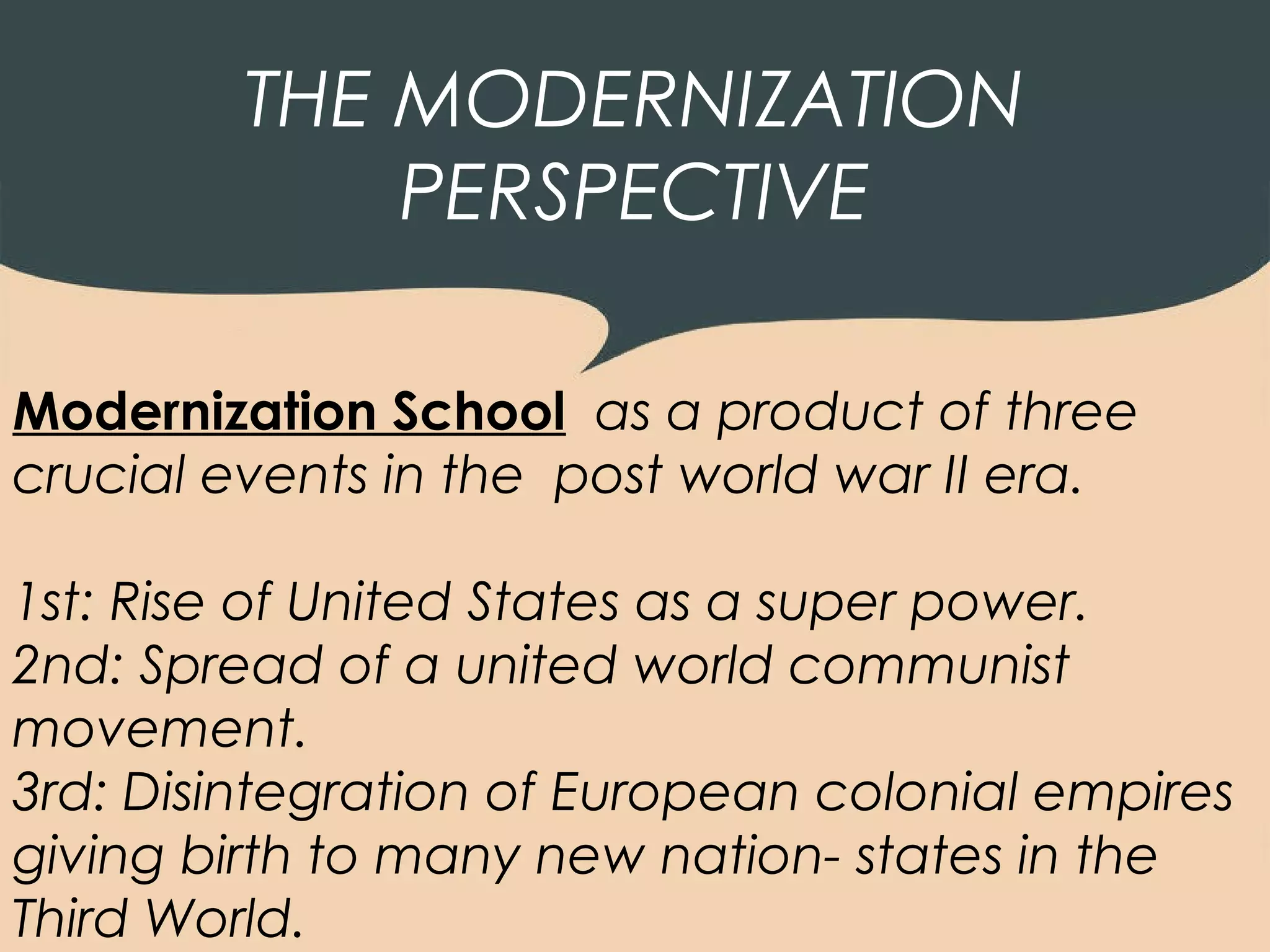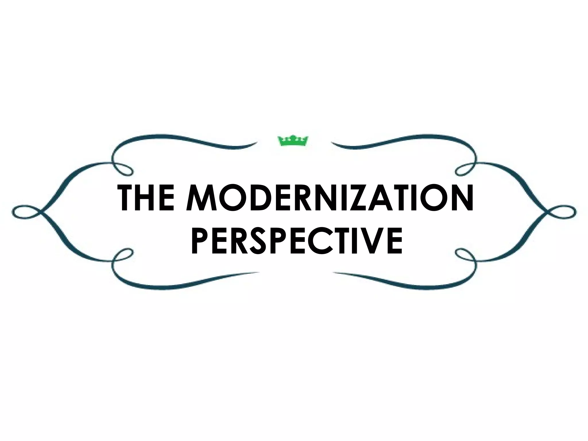 1) The document discusses several perspectives on modernization including the modernization school, evolutionary theory, functionalist theory, and sociological, economic, and political approaches.