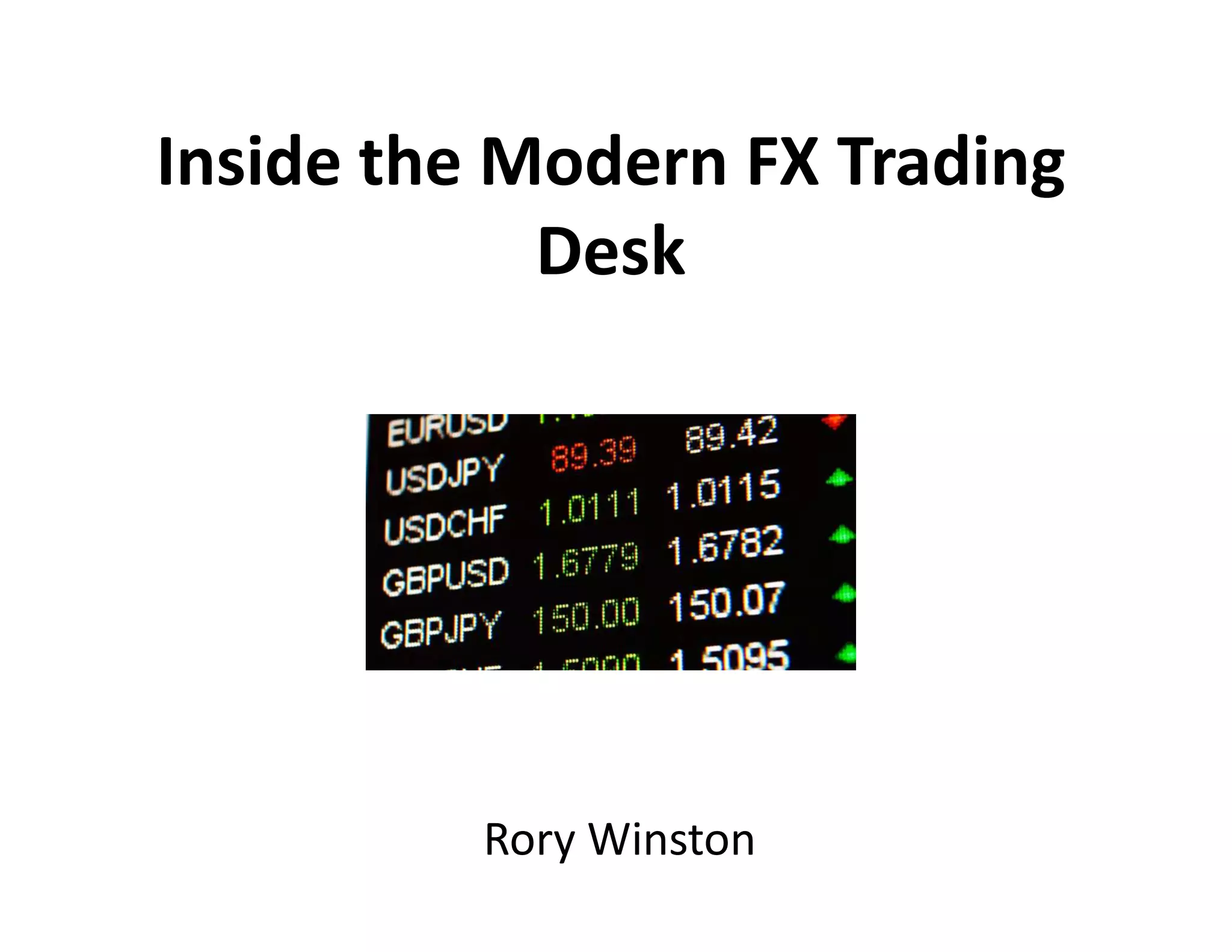 The document discusses the modern foreign exchange (FX) trading desk and market. It notes that FX trading has become highly automated, with algorithms driving an increasing percentage of trading volume. Trading desks have become leaner and more systematic over time as manual voice traders become less common. The market is also facing increasing demands from new technologies, rising costs, and evolving regulation. Overall, the FX market and trading desks are in a period of significant change and evolution driven by new technologies, regulations, and the growing role of algorithms.