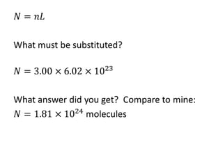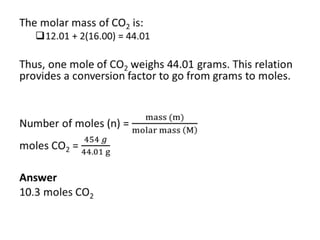 The mole is a unit used in chemistry to express amounts of substances. It represents 6.022x10^23 elementary entities, such as atoms, molecules, ions or other particles of a substance. This number is known as Avogadro's constant, after scientist Amedeo Avogadro who proposed that equal volumes of gases at the same temperature and pressure contain equal numbers of molecules. The mass of one mole of a substance, known as its molar mass, can be used to determine the number of moles in a given mass of that substance and vice versa through calculation.