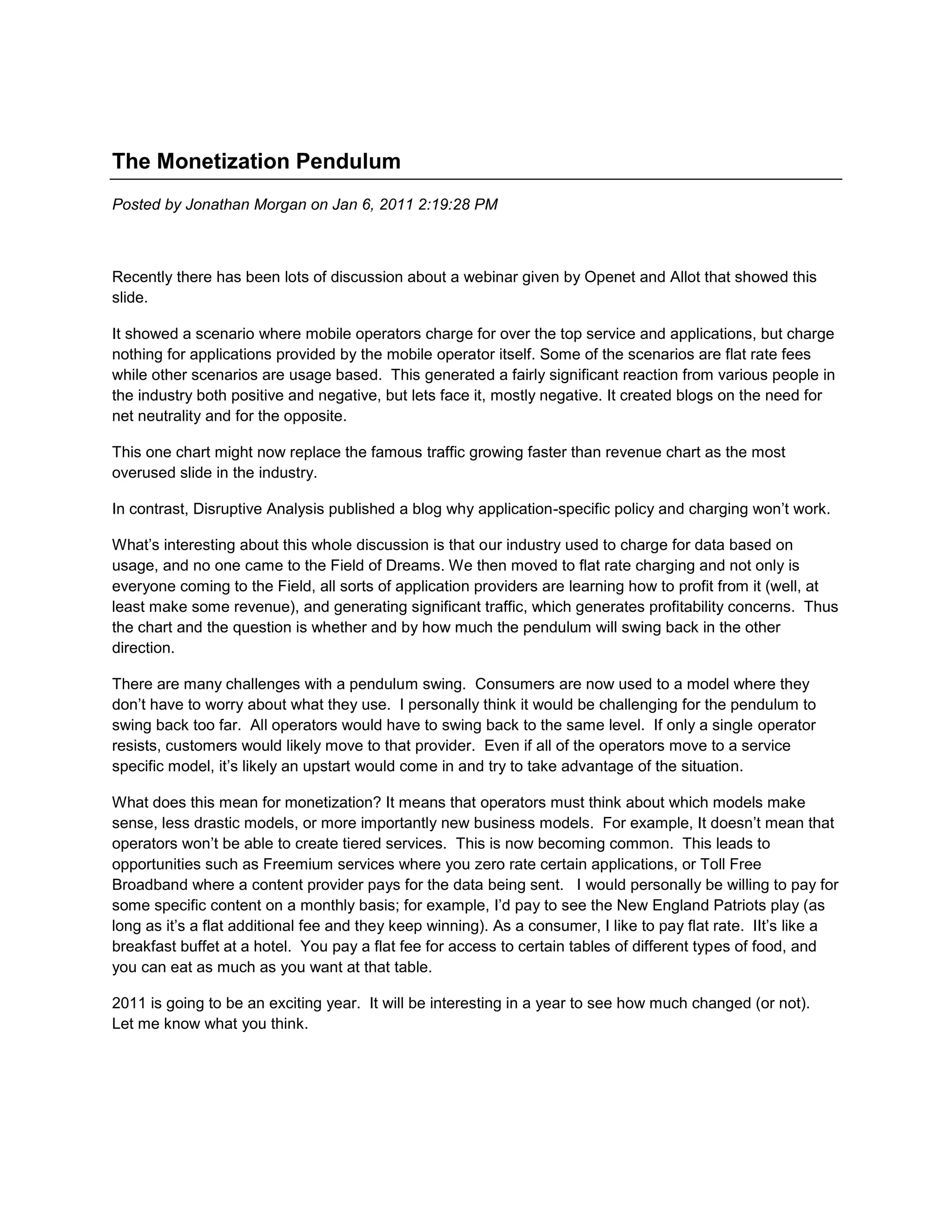 The document discusses the recent trend of mobile operators potentially charging for over-the-top services while offering their own applications for free, sparking significant industry debate. It highlights the shift from usage-based to flat-rate charging in mobile data and the challenges of reverting back to stricter models due to consumer habits. The author suggests that operators must explore new monetization strategies, such as tiered services and freemium models, to adapt to the evolving market.