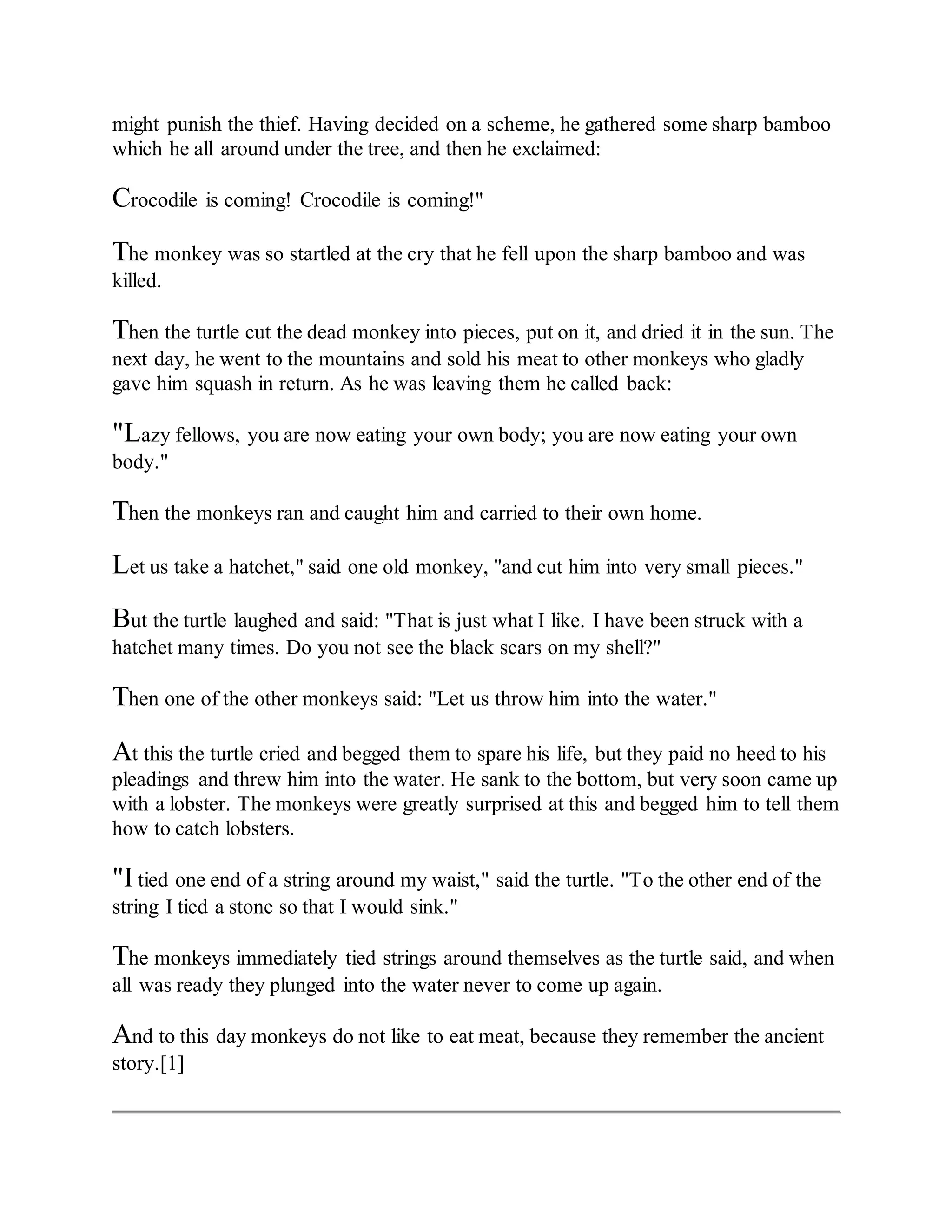 The Monkey and the Turtle tells the story of a hungry monkey who meets a turtle. They work together to plant banana plants, but the monkey eats all the ripe fruit himself, leaving only green bananas for the turtle. When the monkey falls asleep in the tree, the turtle devises a plan for revenge. He scares the monkey by shouting that a crocodile is coming, causing the monkey to fall on sharp bamboo and die. The turtle then tricks other monkeys into eating the dead monkey's meat and plunges into water, tricking the monkeys to follow and drown as well. This explains why monkeys do not like to eat meat.