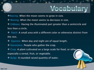 The document discusses various terms related to the moon including its phases, features, effect on tides, and history of exploration. It defines waxing as when the moon appears to grow in size, waning as when it decreases in size, and gibbous as between a half circle and full circle of illumination. It notes the moon's seas are dark patches formed by ancient lava flows and that phases refer to how much is illuminated each day. A harvest moon is a full moon near the autumn equinox that rises earlier each night. The first men on the moon were Neil Armstrong and Buzz Aldrin in 1969.