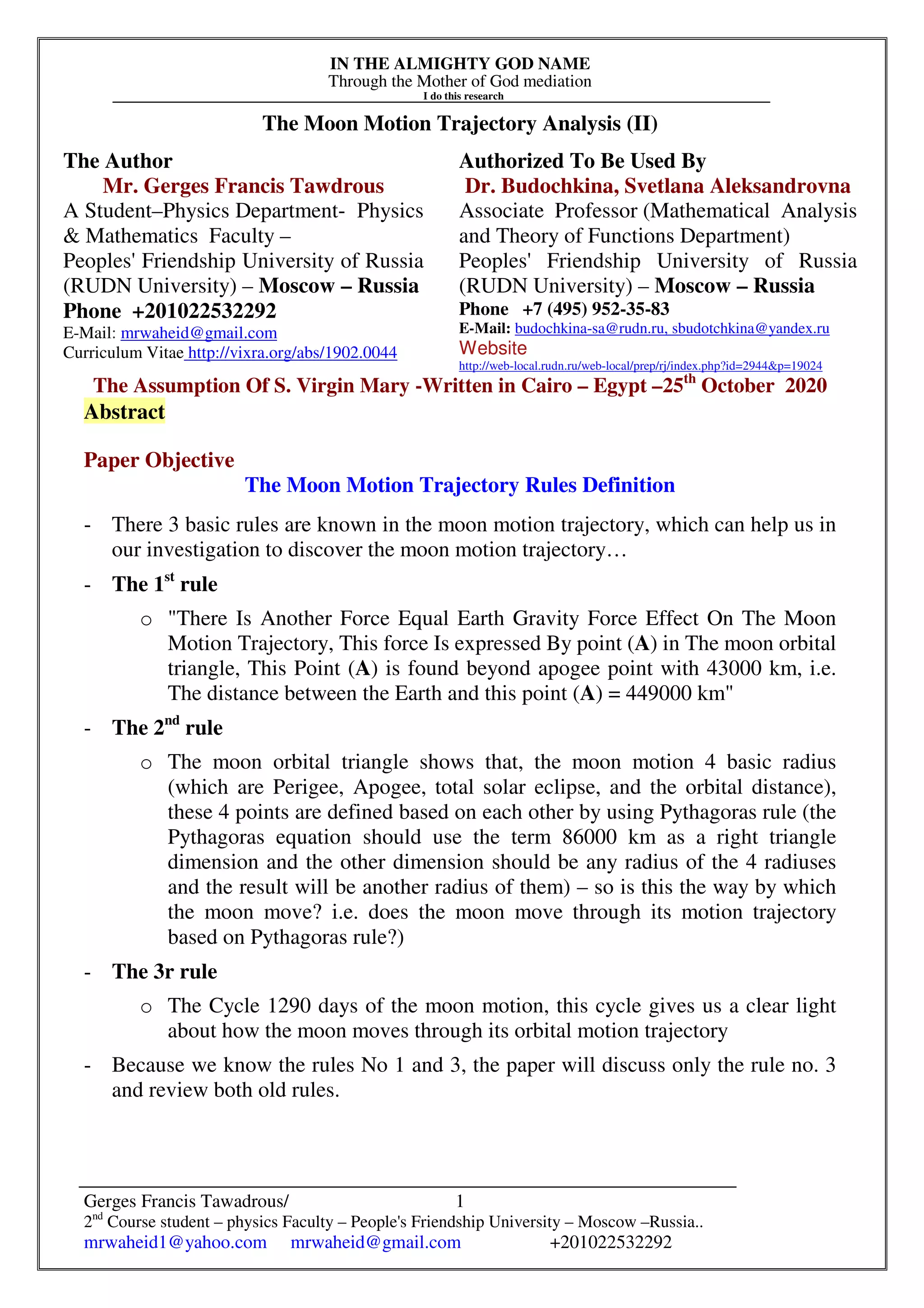 This research paper by Gerges Francis Tawadrous analyzes the moon's motion trajectory, proposing three fundamental rules to understand its movement, including the influence of an additional force beyond Earth's gravity. The study finds that the moon may follow a Pythagorean approach in its motion and identifies a significant cycle of 1290 days as crucial in determining its orbital characteristics. The conclusions suggest that gravitational influences from inner planets might also affect the moon's trajectory, showcasing a complex interaction within the solar system's dynamics.