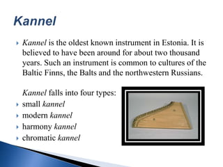 The most popular traditional stringed instruments in Estonia are various types of kannel (zither), bowed harp, fiddle, and psalmodikon. Kannel comes in four types and is the oldest known instrument in Estonia, dating back around 2,000 years. The bowed harp reached Estonia through Swedish settlers and is played by placing it on the knees and bowing 3-4 horsehair or sheep intestine strings. Fiddle came to Estonian towns in the 17th century and spread among peasants in the 18th century, eventually replacing bagpipes. Psalmodikon is a relatively new instrument dating from 1829 based on a monochord with a single bowed string.