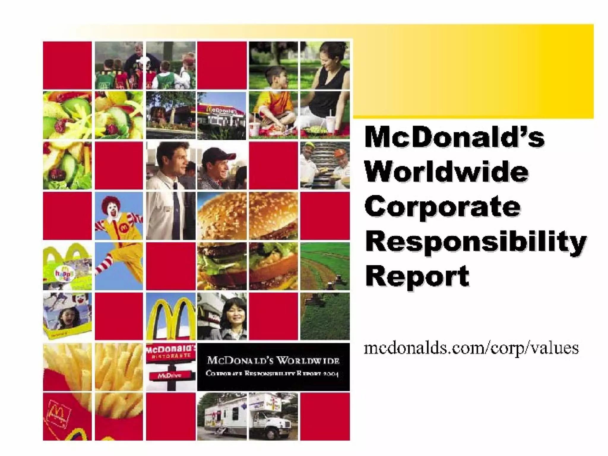The document discusses McDonald's underperformance between 1999-2002 and the need for a strategic reevaluation. It emphasizes the necessity for significant reductions in emissions and healthier menu options, alongside corporate social responsibility (CSR) initiatives. The text highlights contradictions in traditional CSR approaches and advocates for a commitment to zero tolerance for practices like deforestation.