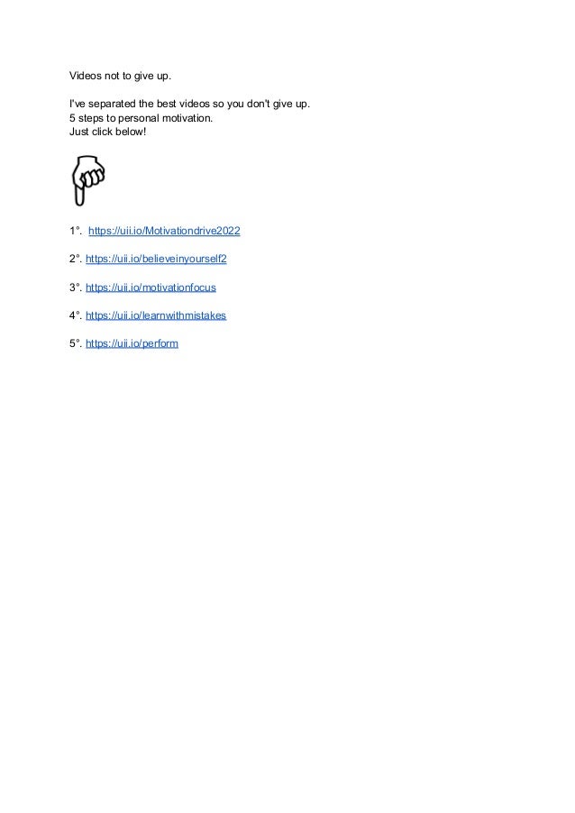 This document provides 5 video links intended to motivate and prevent giving up. The videos cover topics like personal motivation, believing in yourself, focusing on motivation, learning from mistakes, and performing well. Clicking the links below will direct the user to motivational videos on staying determined.