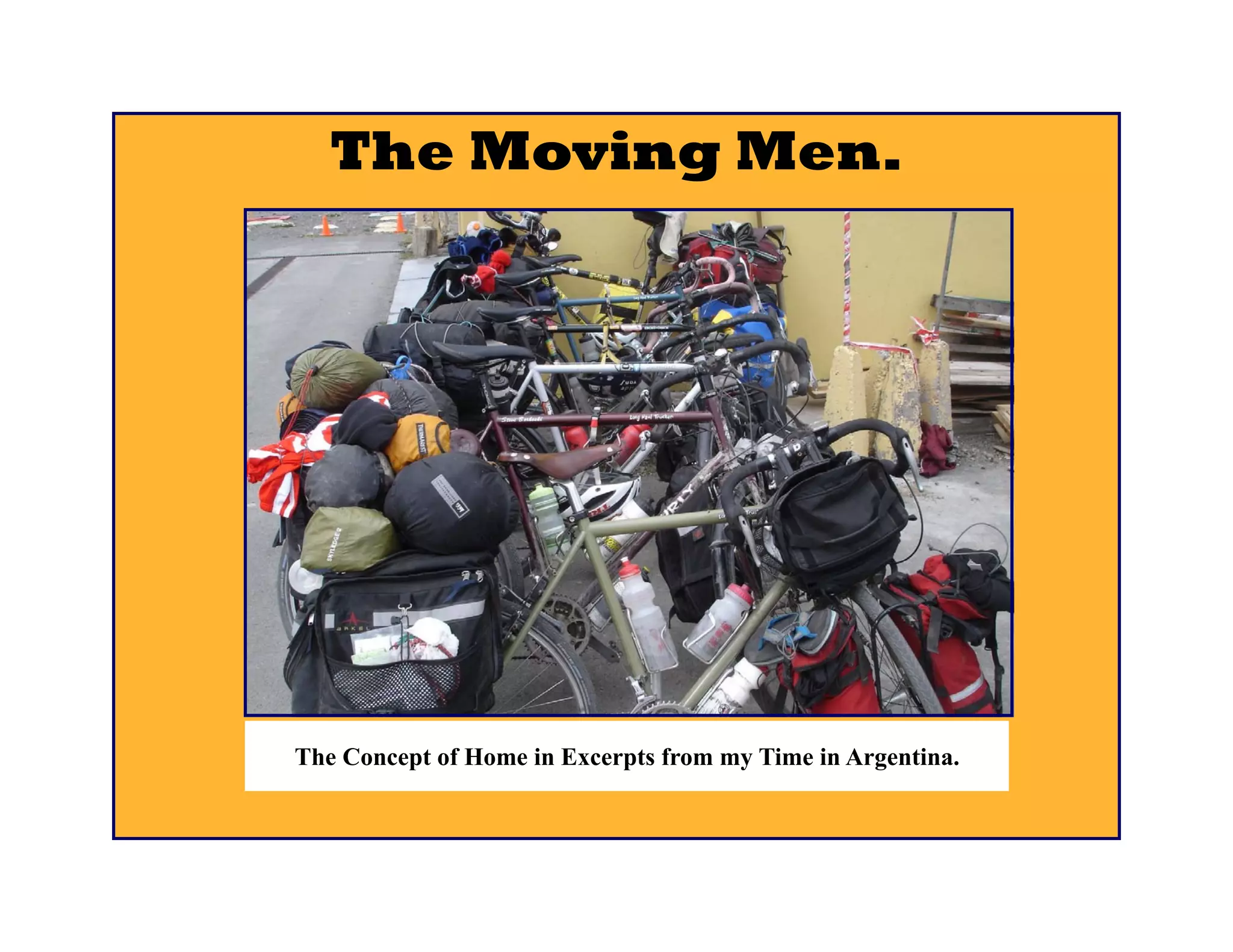 This document provides a summary of the author's experience bicycling from northern Argentina to Ushuaia, the southernmost city in the world, over the course of several months. The author describes meeting many other travelers ("moving men") along the way who were also bicycling or motorcycling long distances. These encounters provided opportunities for sharing stories and advice. Through challenges like harsh weather and difficult terrain, the author found encouragement in the camaraderie of other travelers and in poetry. The trip culminated in reuniting with many of the people he had met earlier in the journey.