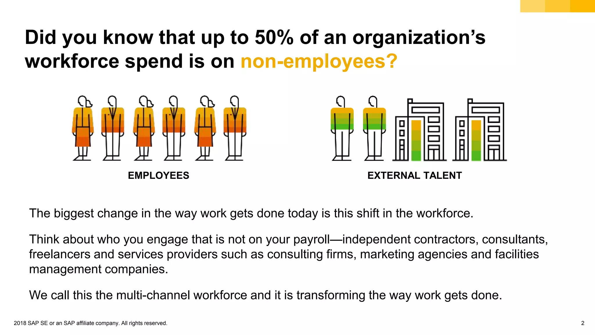 The document discusses the increasing reliance on external talent within organizations, highlighting the challenges and benefits associated with managing a multi-channel workforce, which includes independent contractors and service providers. SAP Fieldglass offers solutions to streamline the management of this external workforce, improving visibility, compliance, and operational efficiency while also helping organizations achieve significant cost savings. Case studies illustrate successful implementations, showcasing the effectiveness of SAP Fieldglass in enhancing business outcomes across various industries.