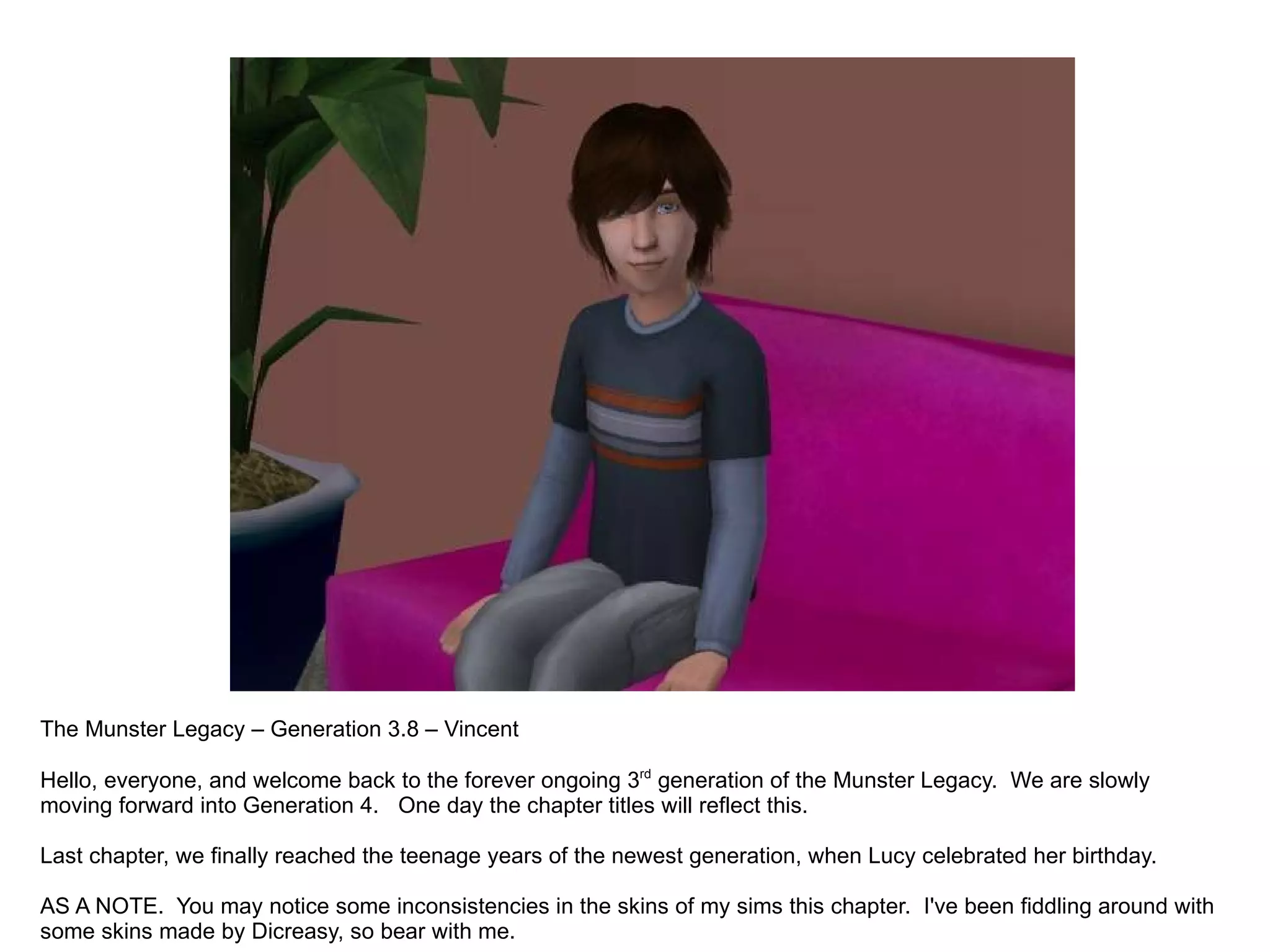 The document summarizes a chapter in the ongoing Munster Legacy series. It describes Vincent celebrating his cousin Basil's birthday party, where he plays with his cousin Leo. The two boys get in an argument over whose father is better, which leads Vincent to angrily throw Leo's ball into the street. Leo chases after the ball into the street, worrying the adults watching.