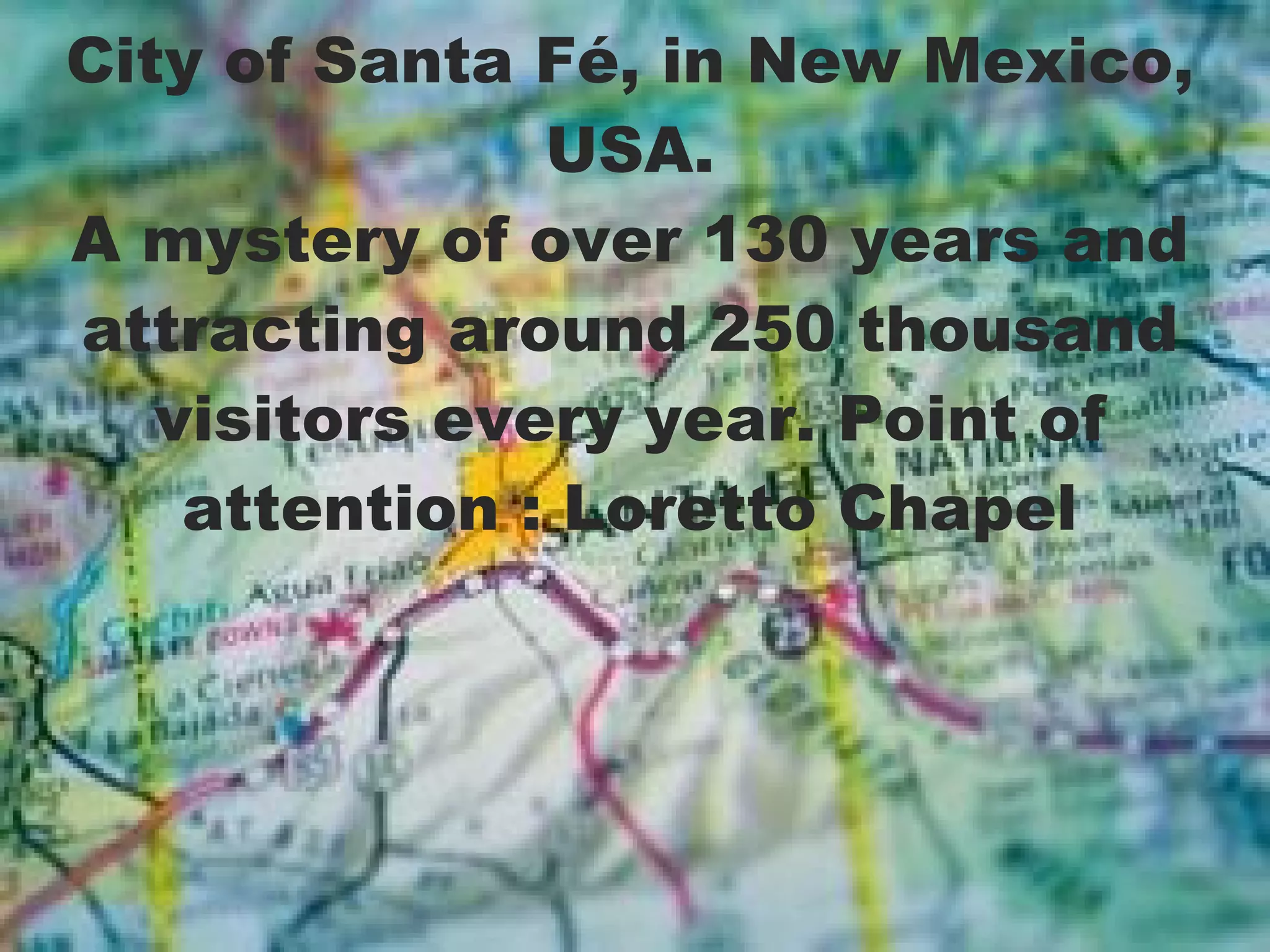 The document summarizes the story of the Loretto Chapel in Santa Fe, New Mexico and the mysterious staircase constructed there in the 19th century. When the chapel was finished, the nuns discovered they had no way to access the second level. After 9 days of prayer, a carpenter appeared and built the staircase without any nails or supports in just one day. The staircase remains standing without explanation and the carpenter then disappeared, fueling rumors he was Saint Joseph answering their prayers. The staircase is now a site of pilgrimage due to its three mysteries: the identity of the carpenter, how it remains standing without supports, and where the unusual wood came from.