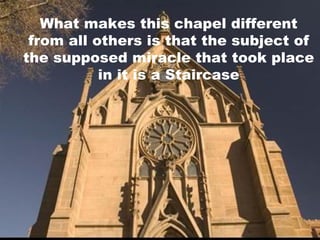 The Loretto Chapel in Santa Fé, New Mexico is famous for its "miraculous staircase" that was constructed mysteriously in the 19th century. The nuns prayed to St. Joseph for help building a staircase and a man arrived claiming to be a carpenter. He built the impossible spiral staircase without nails or a central support in just 9 days then disappeared. Engineers still cannot explain how the staircase remains standing without support. The wood used is also not native to the region, adding to the mystery of how it was constructed. The staircase has 33 steps, matching the age of Jesus at his death, strengthening the belief it was a miracle.