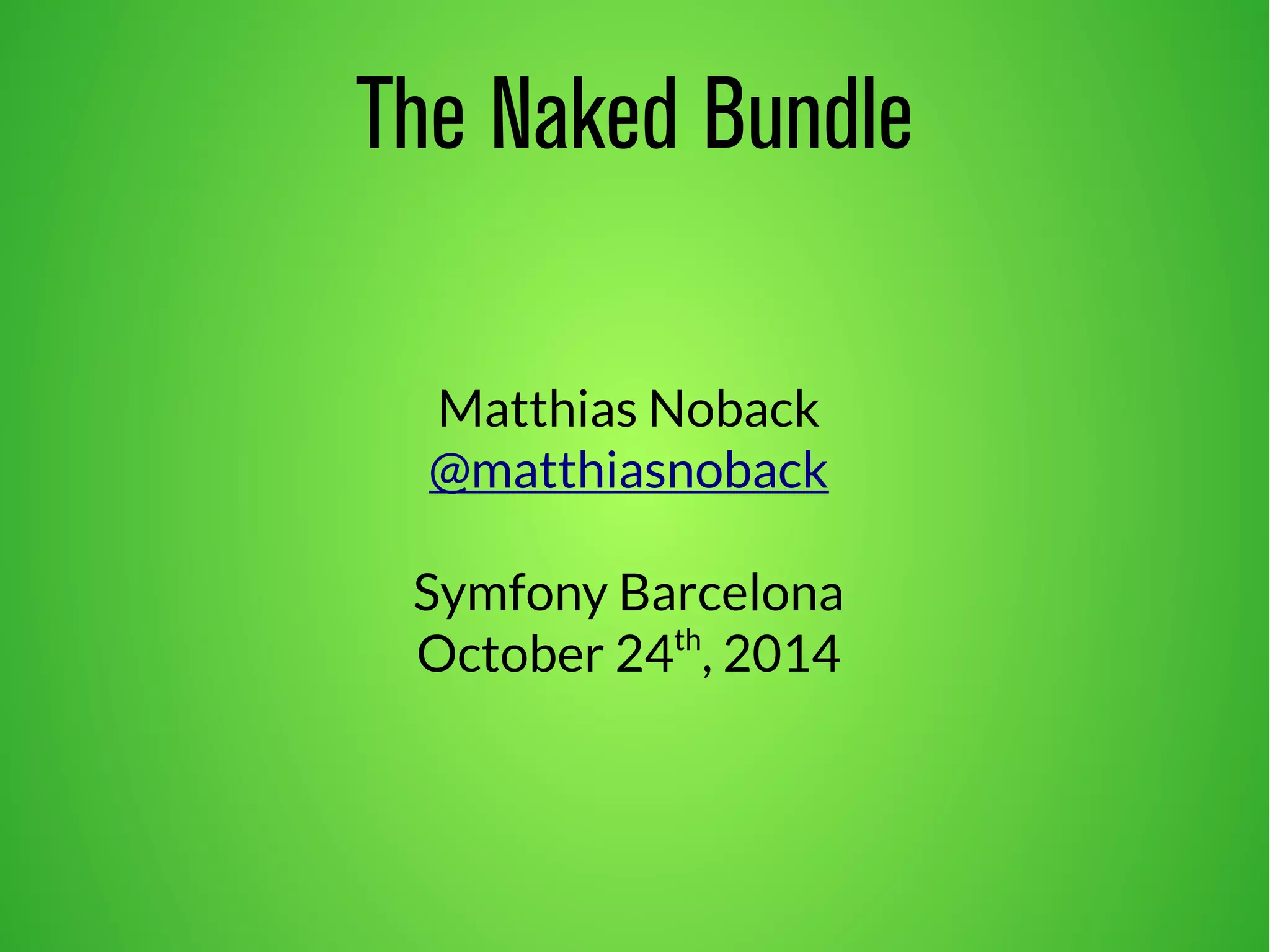 The document discusses the concept of 'naked bundles' in the Symfony framework, advocating for cleaner, more reusable code that minimizes reliance on bundle conventions. It emphasizes the importance of explicit dependencies and suggests reorganizing code and resources to enhance modularity and reusability across different frameworks. Ultimately, the talk argues for a shift in how we perceive and structure Symfony applications, moving towards a design that prioritizes the code itself over framework constraints.
