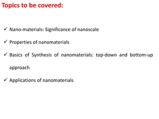 The document provides an overview of nanomaterials, covering their significance, properties, and synthesis methods, as well as their applications in various fields. It distinguishes nanomaterials into three categories based on dimensions and explains the impact of nanoscale on physical and chemical properties due to increased surface area and quantum effects. Key synthesis techniques discussed include top-down and bottom-up approaches, while highlighting the influence of size on properties like optical, thermal, magnetic, and chemical behavior.