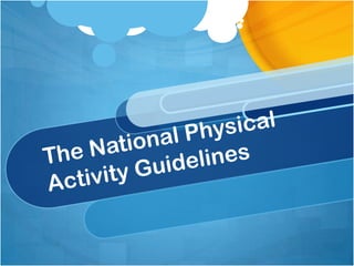 The document outlines physical activity (PA) and sedentary behavior guidelines for various age groups from children to older adults. For children ages 0-5, it recommends floor-based activities for ages 0-1, at least 3 hours of active play per day spread across ages 1-3 and 3-5, and limiting screen time to 1 hour per day for ages 2-5. For children 5-12 and youth 12-18, it recommends at least 60 minutes of moderate to vigorous PA per day. For overweight or obese children and youth, it recommends more PA than currently engaged in. For adults 18-65, it recommends at least 30 minutes of moderate PA on most days. For older adults 65+, it recommends