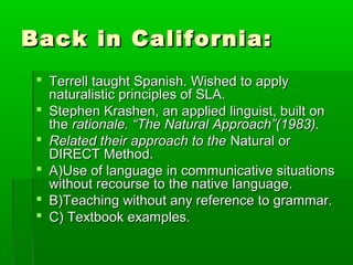 The document summarizes The Natural Approach theory of second language acquisition proposed by Stephen Krashen and Tracy Terrell. The theory emphasizes natural language acquisition over formal language learning, prioritizing meaningful communication, vocabulary building, and lowering the affective filter over grammar instruction. It proposes that acquisition occurs through extensive comprehensible input and that students progress through silent, early production, and speech emergence phases. The teacher's role is to provide rich comprehensible input and a low-anxiety classroom environment.