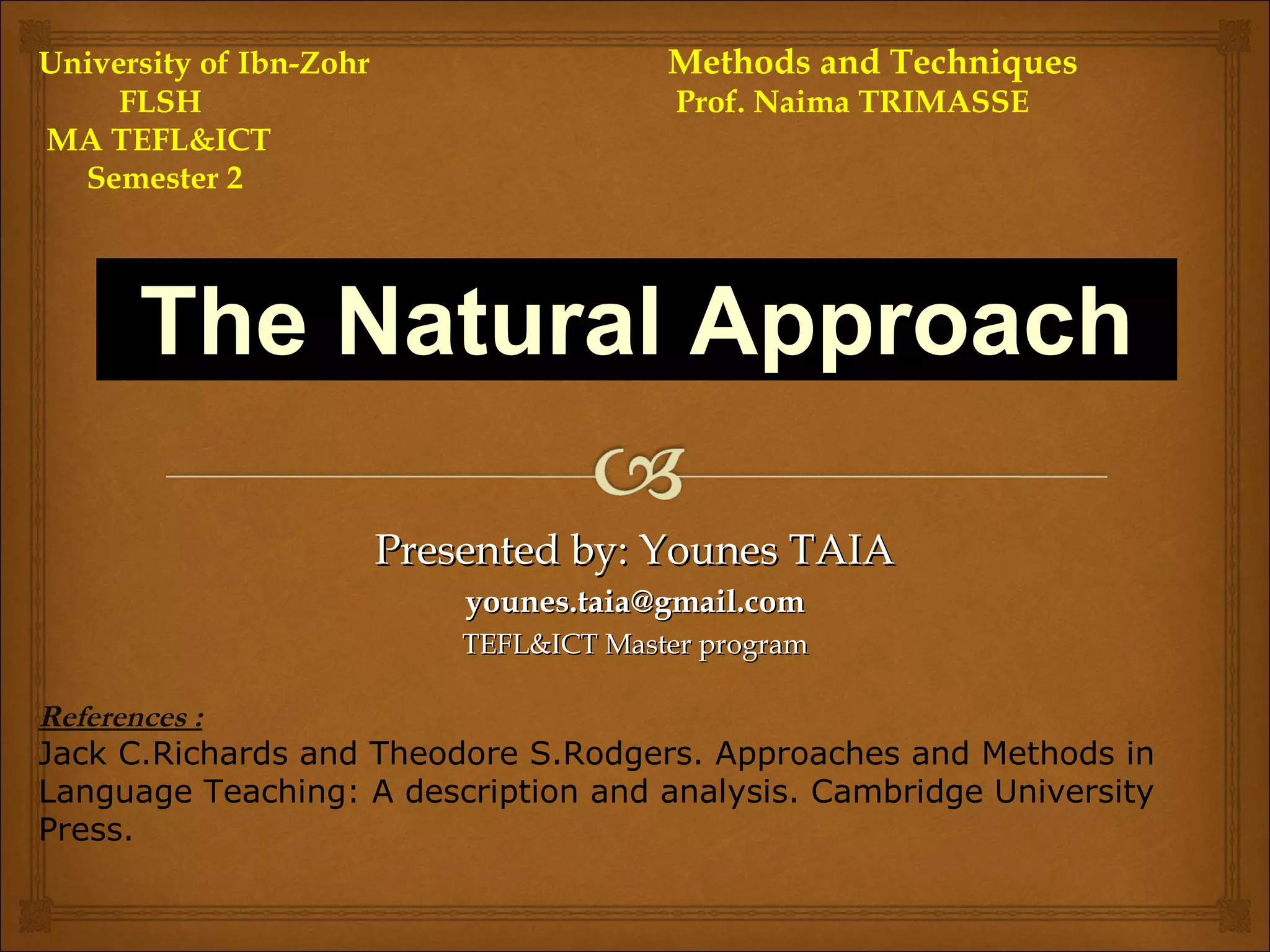 The Natural Approach is a language teaching method based on principles of natural language acquisition. It aims to help beginners become intermediate learners while enhancing communication skills through a focus on meaningful input. Key principles include using TPR activities, delaying speech production, creating a relaxed environment, and providing comprehensible input slightly above learners' levels. Techniques involve TPR, group work, games and role-plays to practice the target language while minimizing error correction. The goal is a communicative syllabus focusing on oral and written skills through a logical sequence emphasizing meaning, vocabulary and target language use. Potential weaknesses include passive learners during silent periods and uncertainty around error treatment and appropriate input levels.