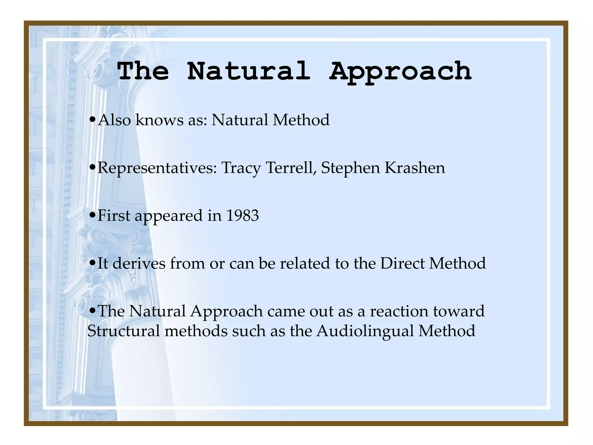 The Natural Approach focuses on acquiring language through meaningful communication and interaction, without explicit grammar instruction. It is based on Krashen's theories of language acquisition, including the idea that acquisition is subconscious and separate from conscious learning. The approach emphasizes understanding messages in the target language through modified input from the teacher.