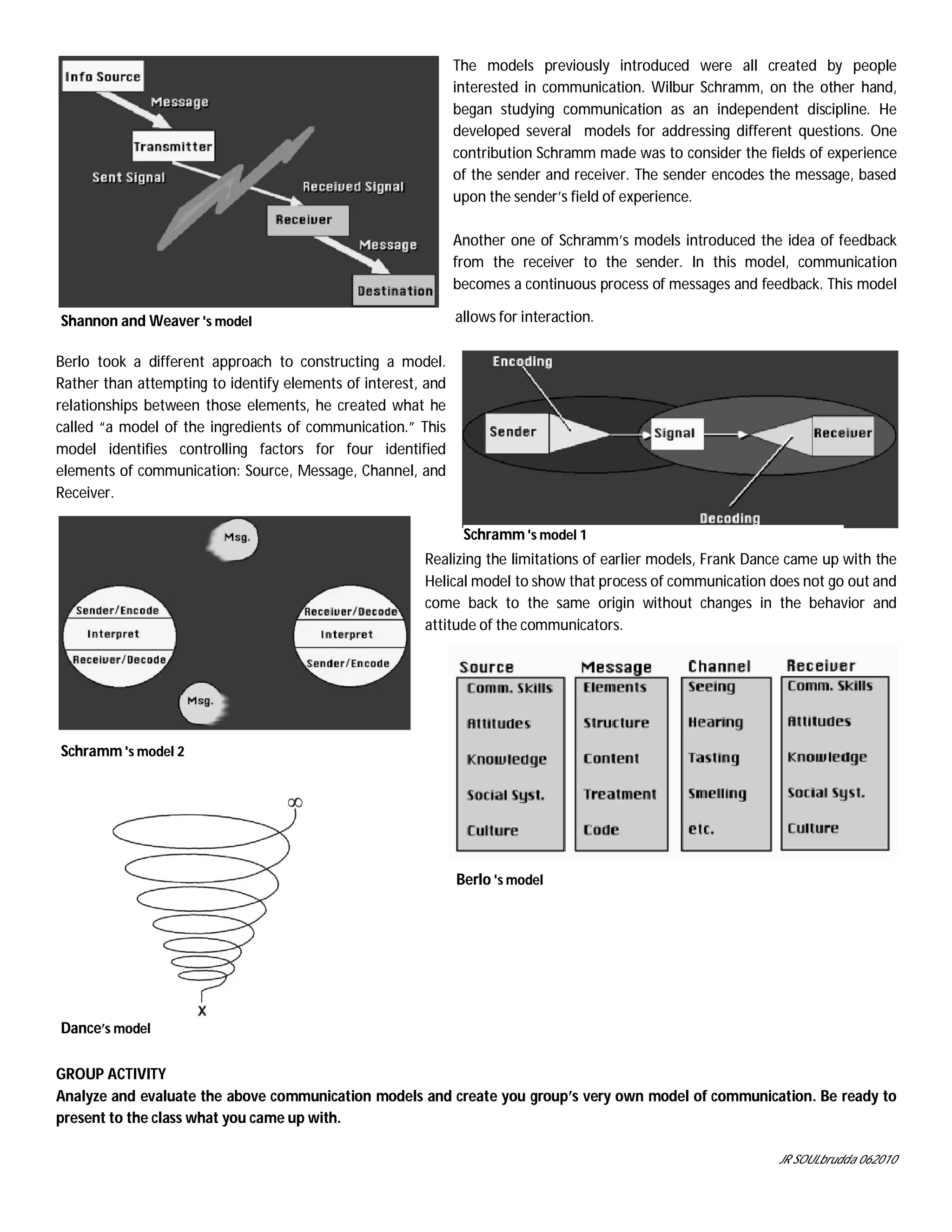 The document discusses several definitions of communication and models of the communication process. It defines communication as the transmission of information, ideas, emotions, and skills through symbols. Communication is essential for human relationships, learning identity, and satisfying social and instrumental goals. Several influential models are described, including Aristotle's speaker-audience model, Laswell's "who says what" model incorporating multiple factors, Shannon and Weaver's model adding transmitters and receivers, and Schramm's model introducing feedback and fields of experience. Berlo's model identifies controlling factors for sources, messages, channels, and receivers. Dance's helical model shows communication is an ongoing process that changes communicators.
