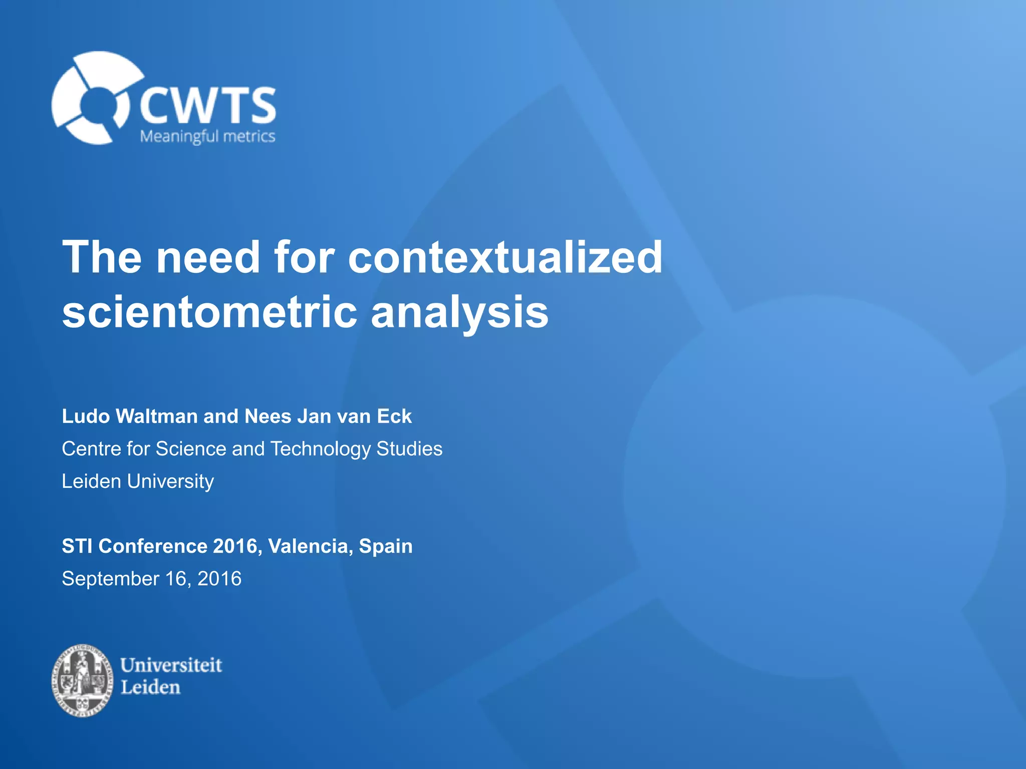 The document discusses the importance of contextualized scientometric analysis, emphasizing the need for effective communication between domain experts and scientometricians. It highlights the limitations of both simple and advanced indicators in research evaluation and argues for a shift towards contextualized analysis to improve understanding and interpretability. The conclusions suggest focusing on enhancing contextual information access and guiding domain experts in utilizing this data for informed peer review.