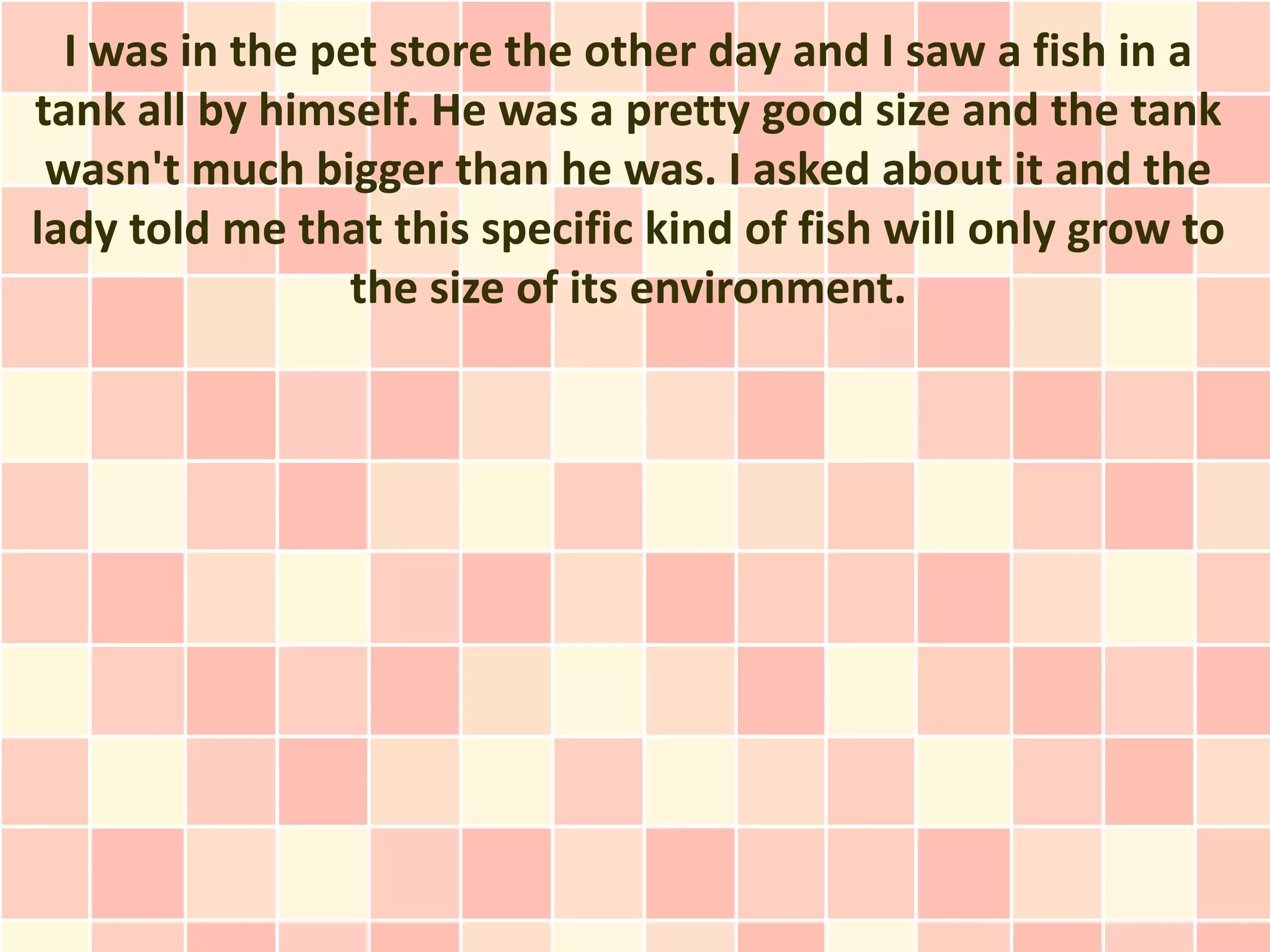 The document discusses breaking out of limiting perceptions and environments to achieve one's full potential. It suggests that people often limit themselves based on their current situation, like a fish that only grows to the size of its tank. However, greatness happens when we stretch ourselves and take risks. We should surround ourselves with supportive people, spend our time wisely on goals and learning, and have the courage to share our ideas and opinions without fear of consequences in order to unlock our gifts and make the most of our lives.