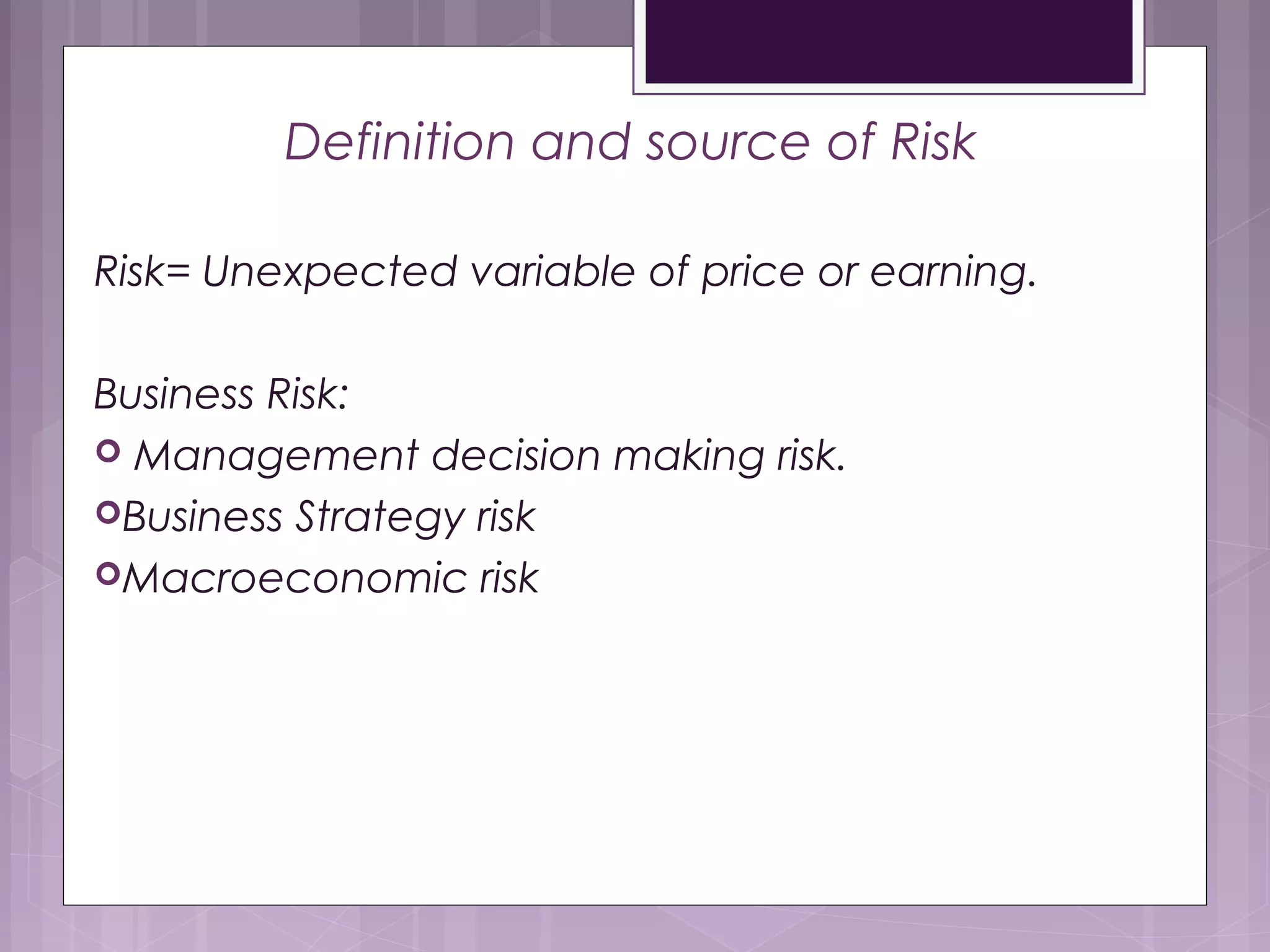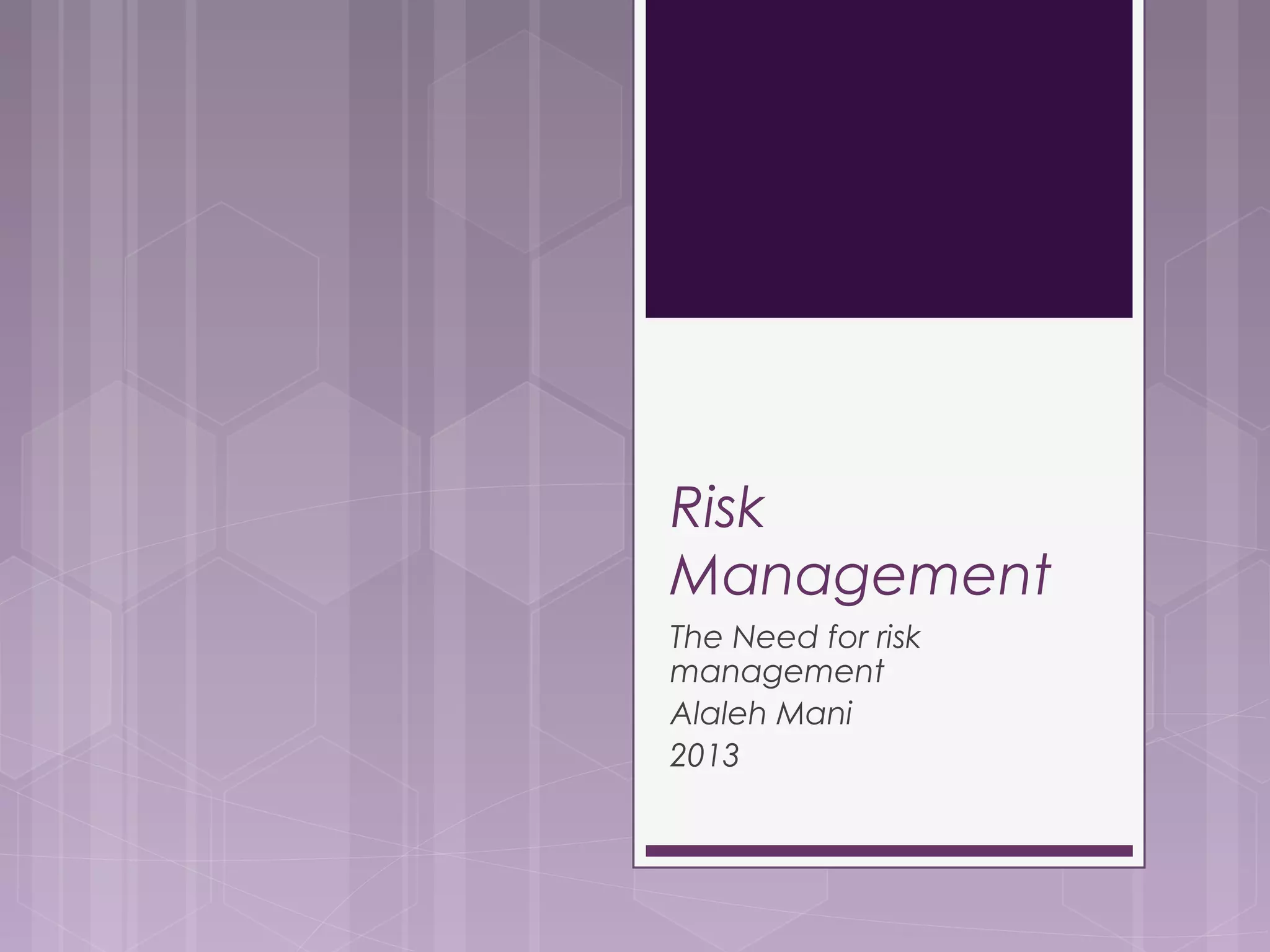 This document discusses the need for risk management. It outlines several events in the 1970s and 2000s that caused financial losses and volatility, raising the need for effective risk management. Globalization and deregulation also increased the importance of risk management by exposing organizations to more currency and interest rate risks. The document then defines various risk management tools like Value at Risk (VAR) and stop-loss limits and discusses how to measure different types of risk like market, liquidity, credit, and operational risk.