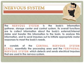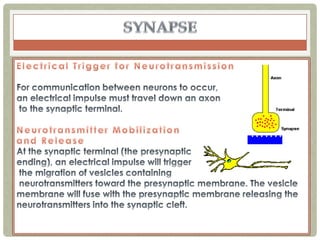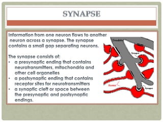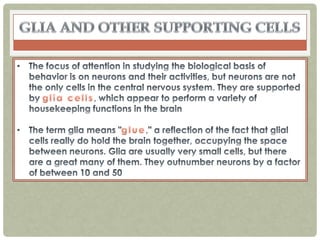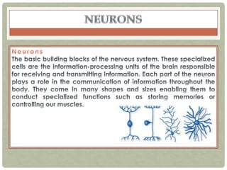 The document discusses the different types of cells found in the nervous system. It explains that neurons are specialized cells that differ from other cells by having dendrites and axons that allow them to communicate electrochemically. There are three main categories of neurons - sensory neurons that receive information, motor neurons that activate muscles/glands, and interneurons that connect sensory and motor neurons. The basic parts of neurons are the cell body, dendrites that receive signals, and a single axon that transmits signals. The document also describes glial cells and how neurons communicate at synapses using action potentials.