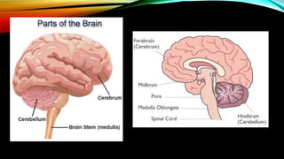 The nervous system is composed of the brain, spinal cord, and nerves. It is responsible for coordinating all functions of the body and controlling thoughts, actions, and vital signs. The brain acts as the control center, interpreting stimuli and directing organs and muscles. The spinal cord connects the brain to the rest of the body and transmits signals back and forth. Within the nervous system, neurons are specialized cells that transmit electrical signals and allow communication between different parts of the body.