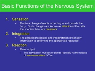 The document provides an overview of the nervous system, including its basic functions, organization, and components. Key points: