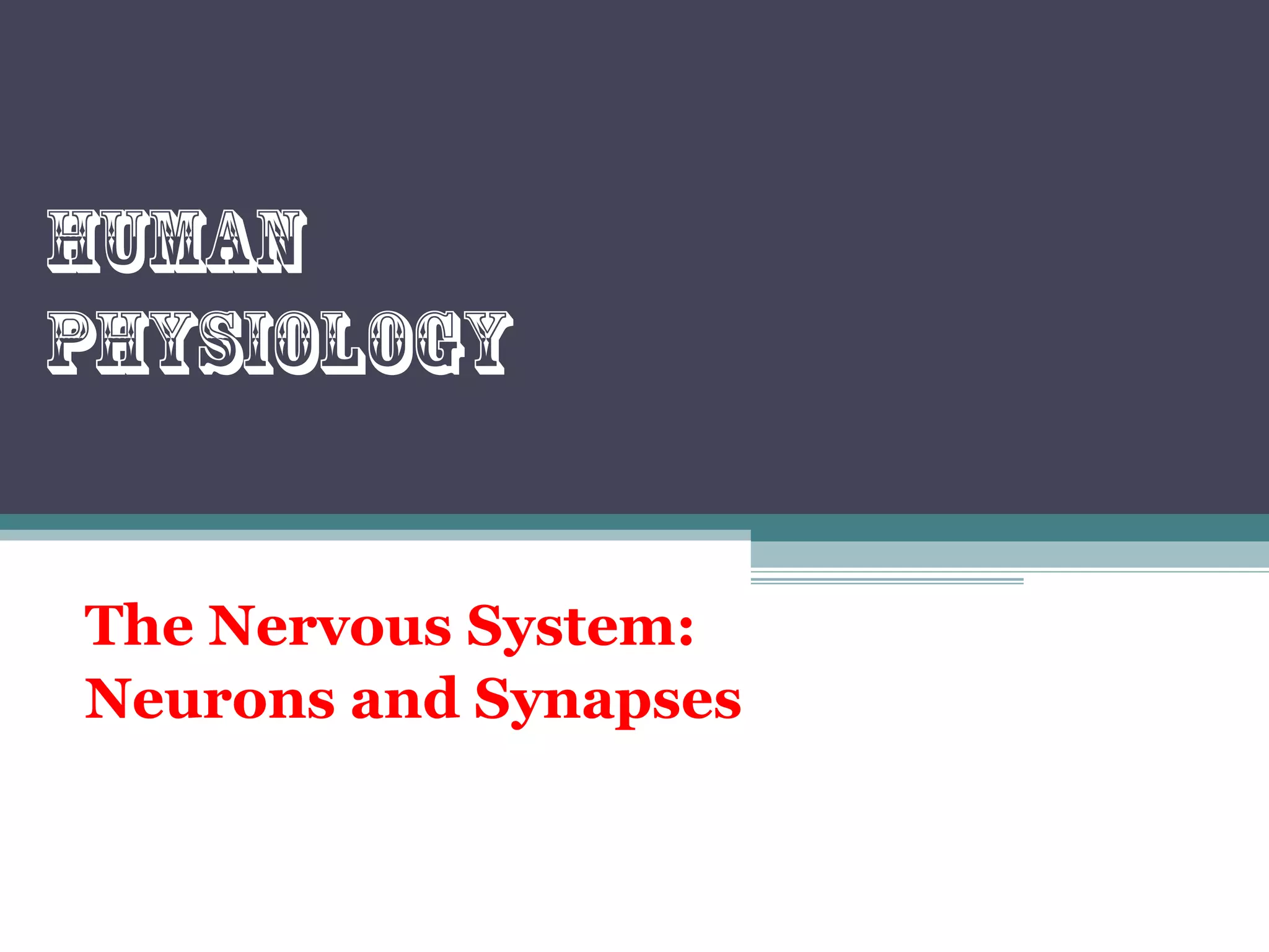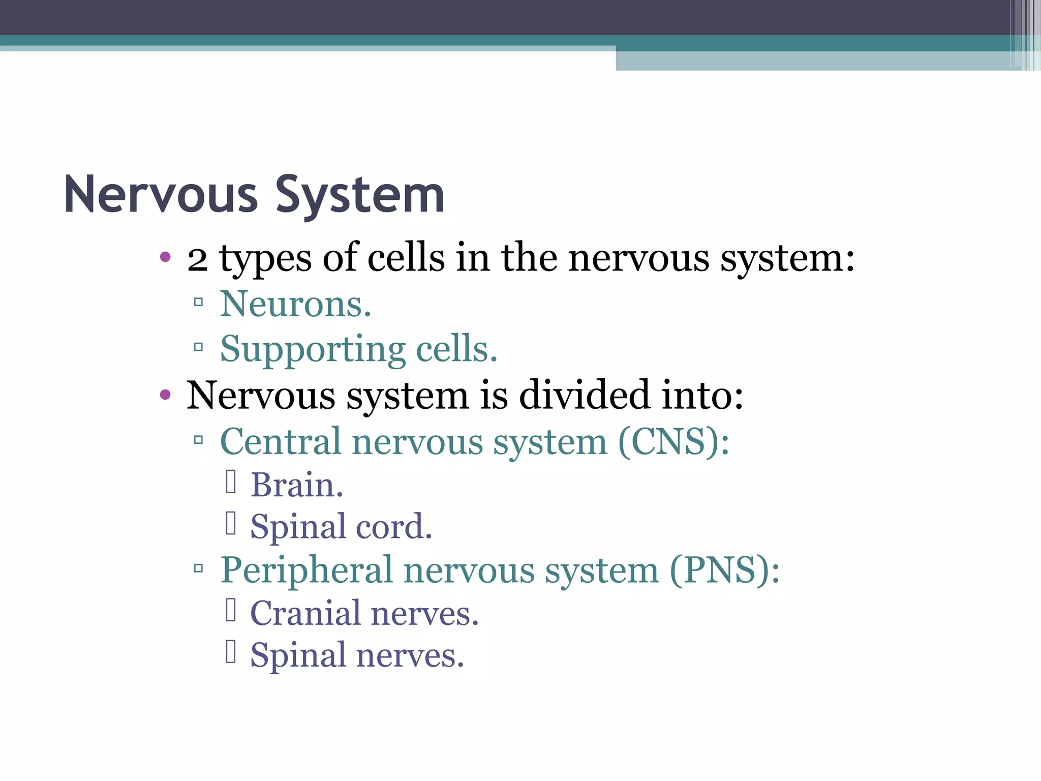 The nervous system contains two main cell types - neurons and supporting cells. Neurons transmit electrochemical signals and are divided into sensory, motor, and interneurons. Supporting cells aid neuron function. The nervous system is divided into the central nervous system (brain and spinal cord) and peripheral nervous system. Neurons contain a cell body, dendrites, and an axon. An action potential is generated when a threshold is reached due to ion flow through voltage-gated channels. At a synapse, a neurotransmitter is released and binds to receptors, generating an excitatory or inhibitory postsynaptic potential.