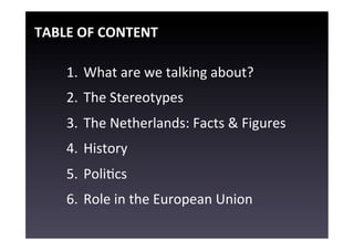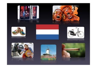 The document provides an overview of the Netherlands. It discusses that the Netherlands refers to the European country, while Holland refers specifically to two provinces. It then gives facts about the population, geography, history, culture, politics and role in the European Union of the Netherlands. The Netherlands is a parliamentary constitutional monarchy and member of the EU. It has contributed significantly to areas like art, science and international law.
