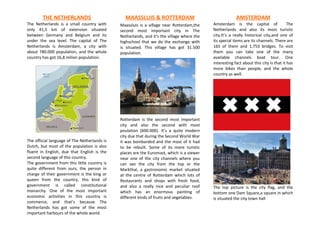 The Netherlands is a small country located between Germany and Belgium, with much of its land below sea level. The capital is Amsterdam, with a population of around 780,000, while the entire country has over 16.8 million people. While the official language is Dutch, most residents also speak English. The government is a constitutional monarchy led by a monarch. One of the largest economic activities is commerce, facilitated by several major ports.