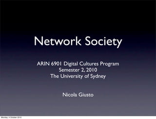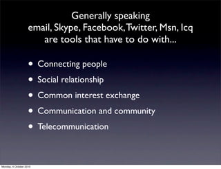 The document discusses the impact of web 2.0 on communication within the network society, highlighting both its potential to connect individuals and the superficiality it can create. Personal anecdotes illustrate how relationships can be maintained through digital communication, yet they may not reflect true intimacy. The author stresses the difference between potential and actual communication, urging attention to the depth of interactions in a digital age.
