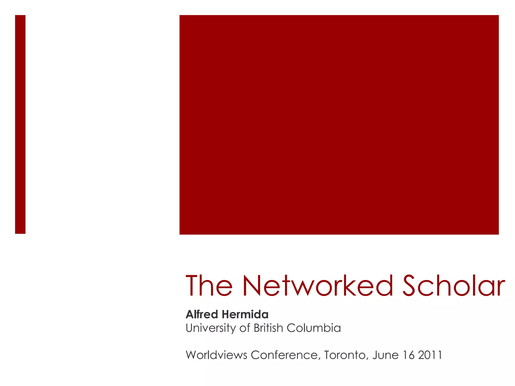 The document discusses the functional building blocks of social media which include identity, conversations, sharing, relationships, reputation, and how these aspects contribute to the networked scholar. It provides references to related resources on each of these blocks and identifies the speaker, Alfred Hermida, as a networked scholar with contact details and a recent publication.