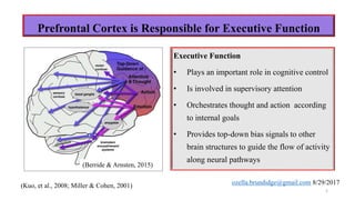 The document discusses executive function and the prefrontal cortex. It notes that the prefrontal cortex is responsible for executive function, which involves cognitive control, supervisory attention, orchestrating thought and action according to goals, and providing top-down signals to other brain structures. Executive function is composed of multiple interrelated high-level cognitive skills like planning, problem solving, cognitive flexibility, and self-regulation that are pivotal for goal-directed behavior. Tasks requiring executive function activate areas of the prefrontal cortex as well as other structures like the thalamus and cerebellum. Damage to these areas can impair performance on tests of attention, working memory, and other executive abilities.