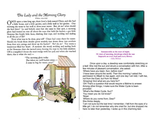 The document discusses the water cycle through a conversation between the Sun and a Dewdrop. The Sun educates the Dewdrop about the various forms water can take as it travels through the water cycle, including as rain, snow, ice, and more. It describes how water can change between liquid, solid and gas states and takes many shapes from clouds to snowflakes to waterfalls. The conversation highlights how water is continuously recycled through nature according to Allah's perfect system.