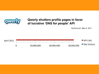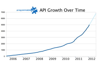 The document discusses business models and strategies for APIs. It notes key metrics for several major APIs and their growth over time. It also provides examples of how companies invest in and partner with developers to build APIs into profitable products and platforms that generate revenue through various monetization strategies like ads, affiliate programs, and commerce APIs. The document advocates for APIs to be a company-wide priority and strategy rather than just an engineering initiative.