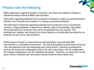 The document discusses IBM Bluemix, a platform designed to enhance developer experience by providing tools for rapid solution delivery, particularly in cloud and mobile environments. It emphasizes the importance of developer choices and community engagement to foster the use of IBM products, alongside features such as DevOps as a service and mobile quality assurance. IBM aims to create an integrated development experience that allows for scalability and efficiency, adapting to changing industry demands.